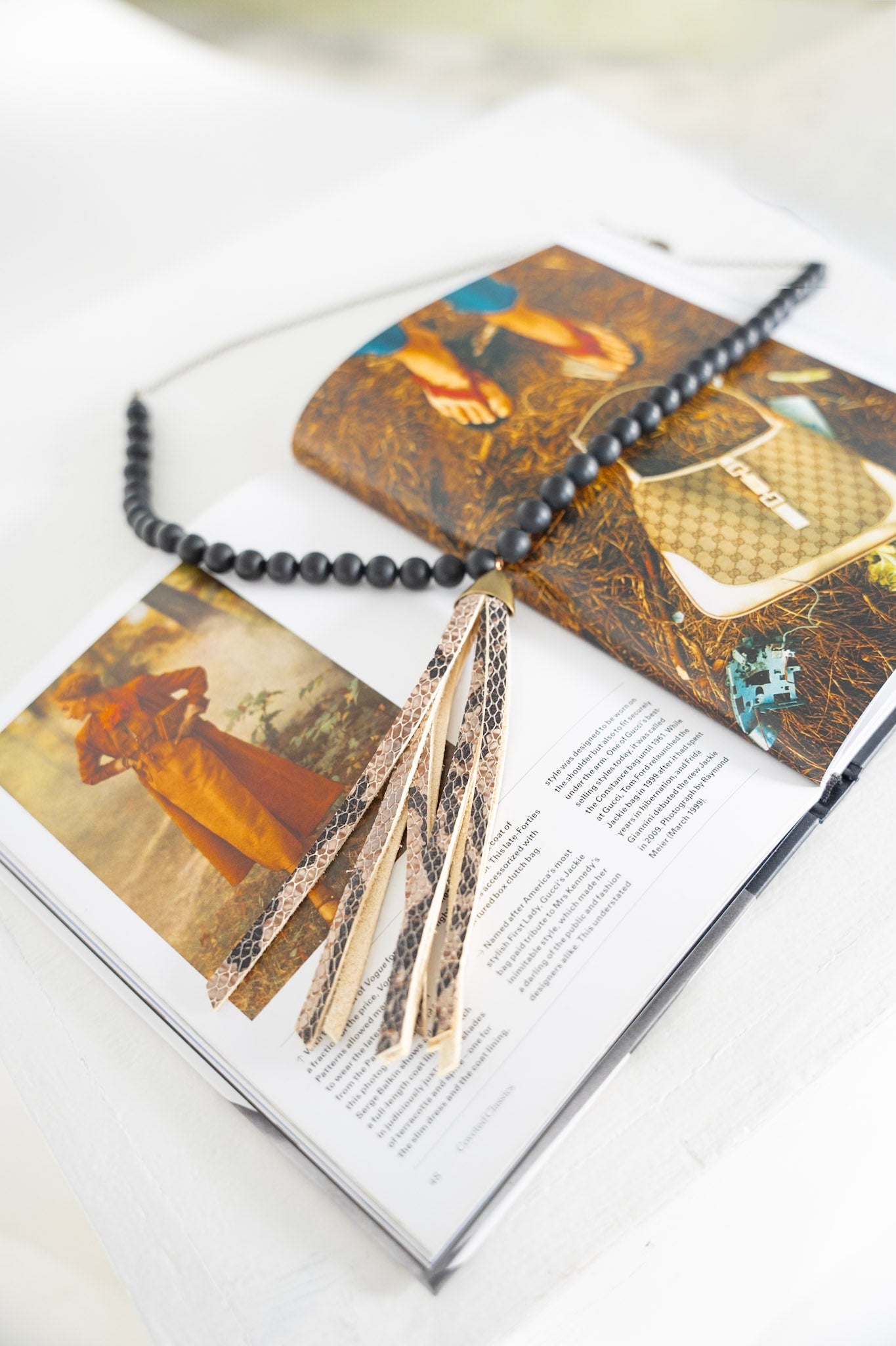 Krista is bold, modern, and made to layer. Featuring smooth agate beads in matte black paired with a long black leather tassel and python-inspired detail, this necklace brings texture and edge to your everyday stack. It’s the kind of piece that turns a simple outfit into a look—no effort required.