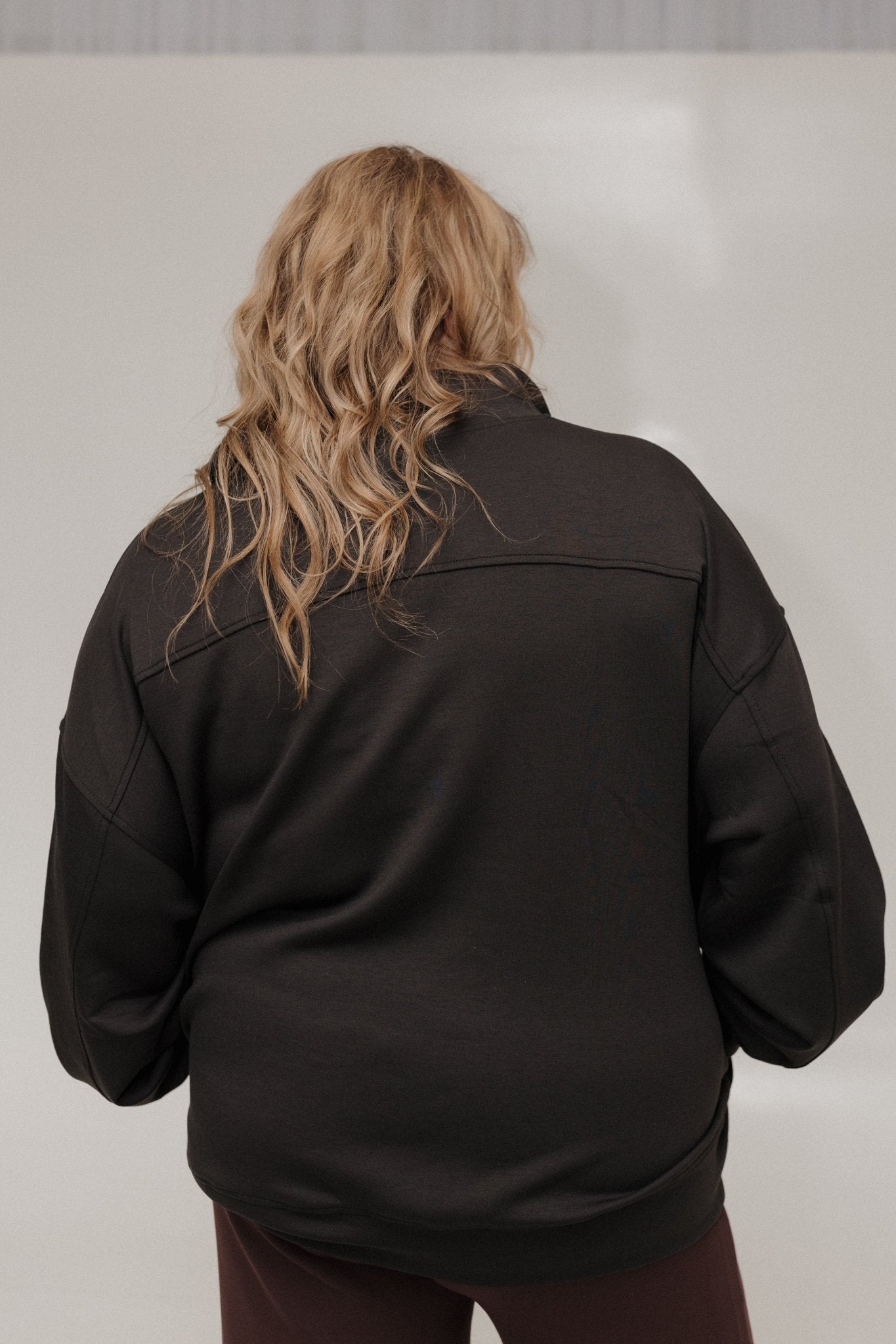 Meet your new go-to black pullover. The AirLuxe Half Zip Dolman Pullover – Black delivers effortless polish with unbeatable comfort. Designed for mid-size and plus-size women, this lightweight layer features Love Marlow’s signature AirLuxe fabric, a sleek half-zip neckline, relaxed dolman sleeves, cuffed hems, functional front pockets, and a subtle back seam detail for a flattering drape.
