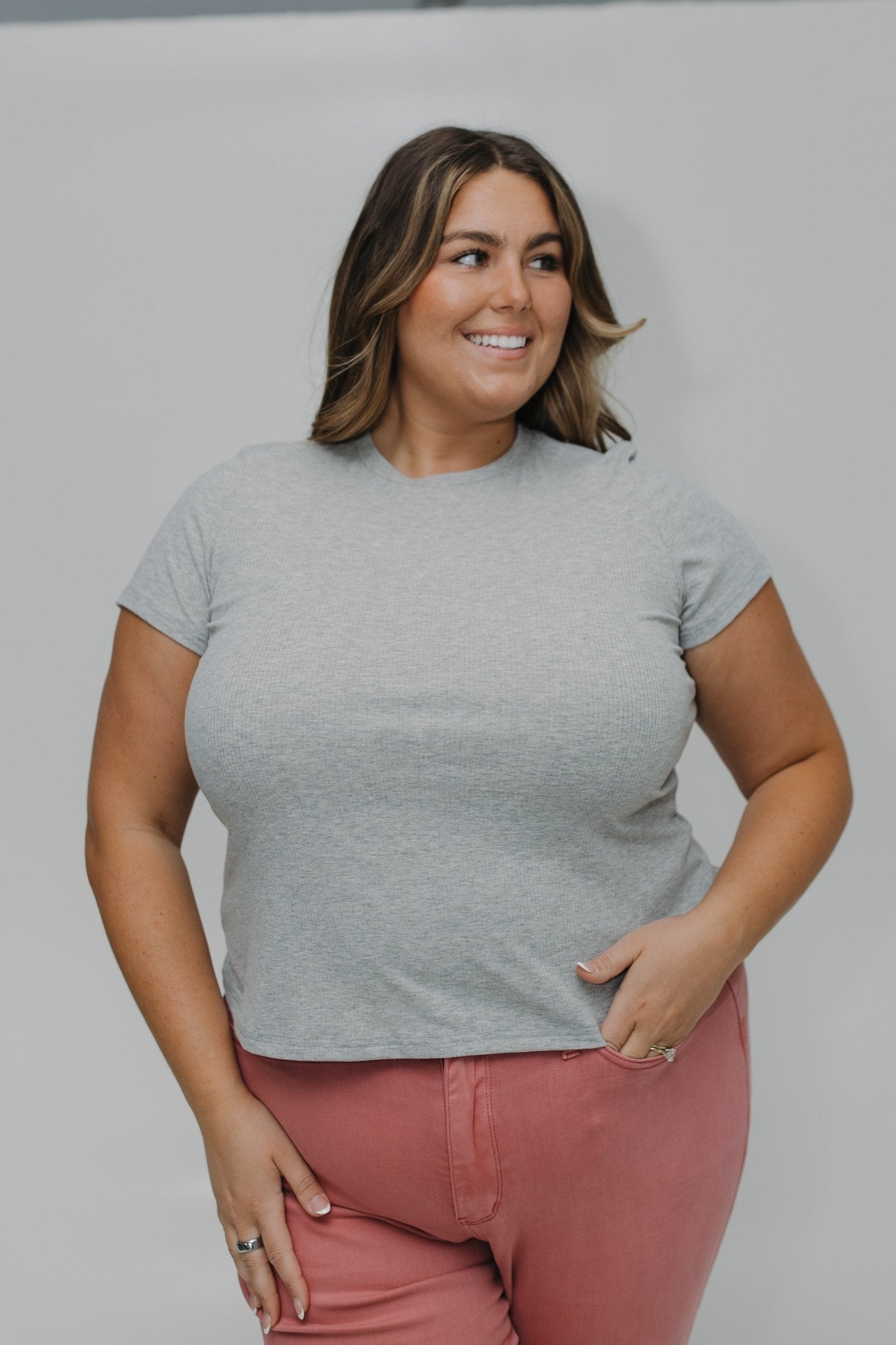 Elevate your style with the Cropped Short Sleeve Ribbed Tee in Heather Grey. Made from lightweight ribbed fabric, this tee offers comfort and unique style with its long crop length and round neck cut. Dare to stand out from the crowd with this adventurous and playful piece! Fits close to the body. May want to size up. Kaylee is wearing a size 3x. Want more information about the model? Visit our Lovely Models page.