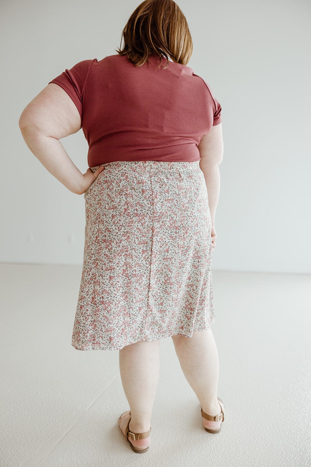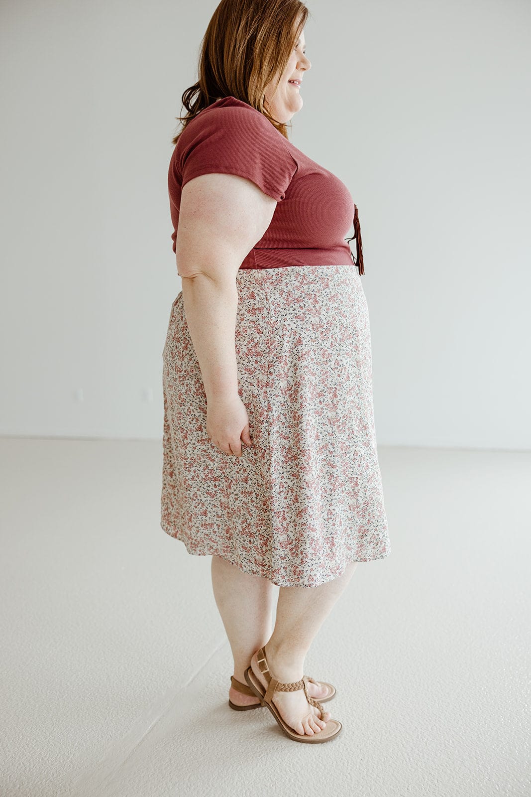 "Add some playful flair to your wardrobe with our A-LINE FLORAL KNEE LENGTH SKIRT. The A-line design and knee-length cut create a flattering silhouette, while the small floral print adds a touch of whimsy. Perfect for a fun and lighthearted look!" We suggest going up a size from your typical. Stacey is wearing a size 3x. Want more information about the model? Visit our Lovely Models page.