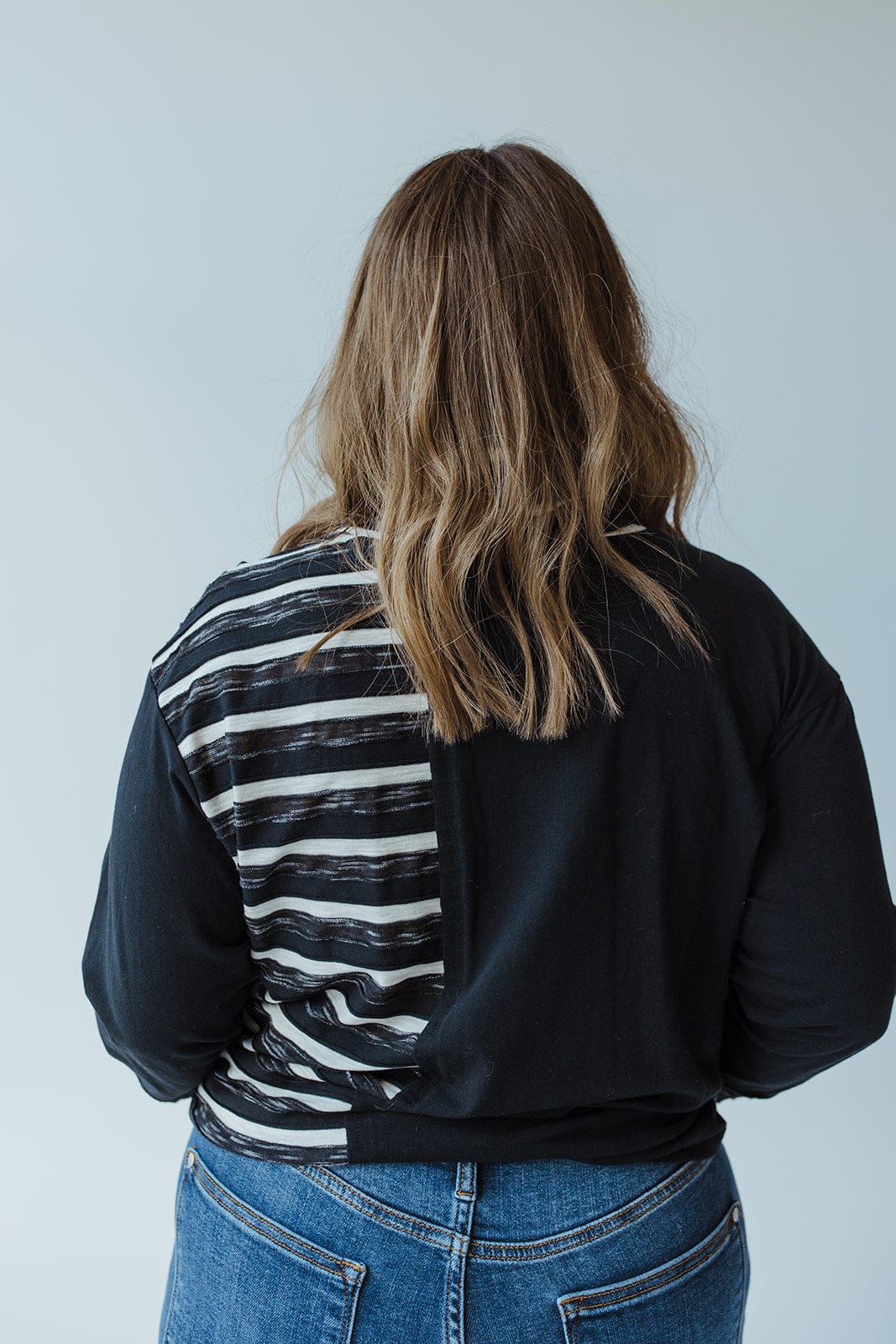This mid to plus-size COWL NECK VARYING STRIPE TUNIC IN BLACK will keep you stylish and comfy all day long! The drawstring detail on the cowl neck and funky pockets with button detail will keep you looking chic. Plus, with its varying stripes of solid and multi-color, you'll make waves wherever you go! Ready for some fun and fashion? Let's go! Fits true to size. We suggest going with your typical size. Misty wearing a size xL. Want more information about the model? Visit our Lovely Models page.