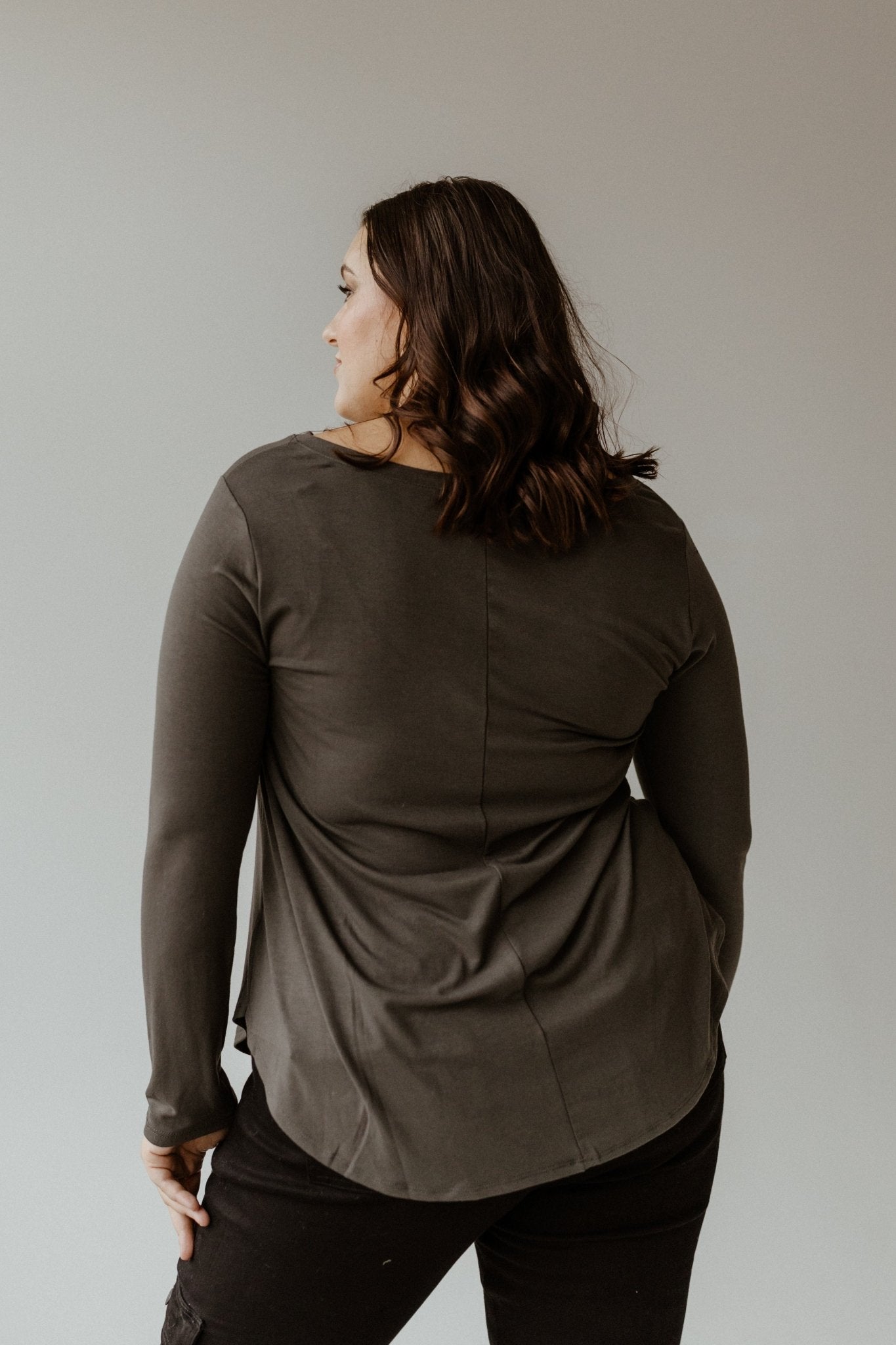 ESSENTIAL V-NECK LONG-SLEEVED TEE IN URBAN CITYSCAPE