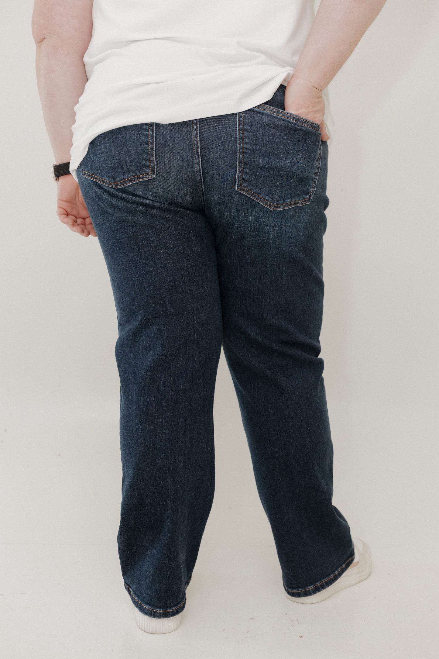 The mid-rise waist offers secure, flattering support, while the classic straight-leg silhouette pairs effortlessly with everything from cozy sweaters to polished blazers. Designed with mid-size and plus-size petites in mind, these jeans are a true everyday staple you’ll reach for again and again.