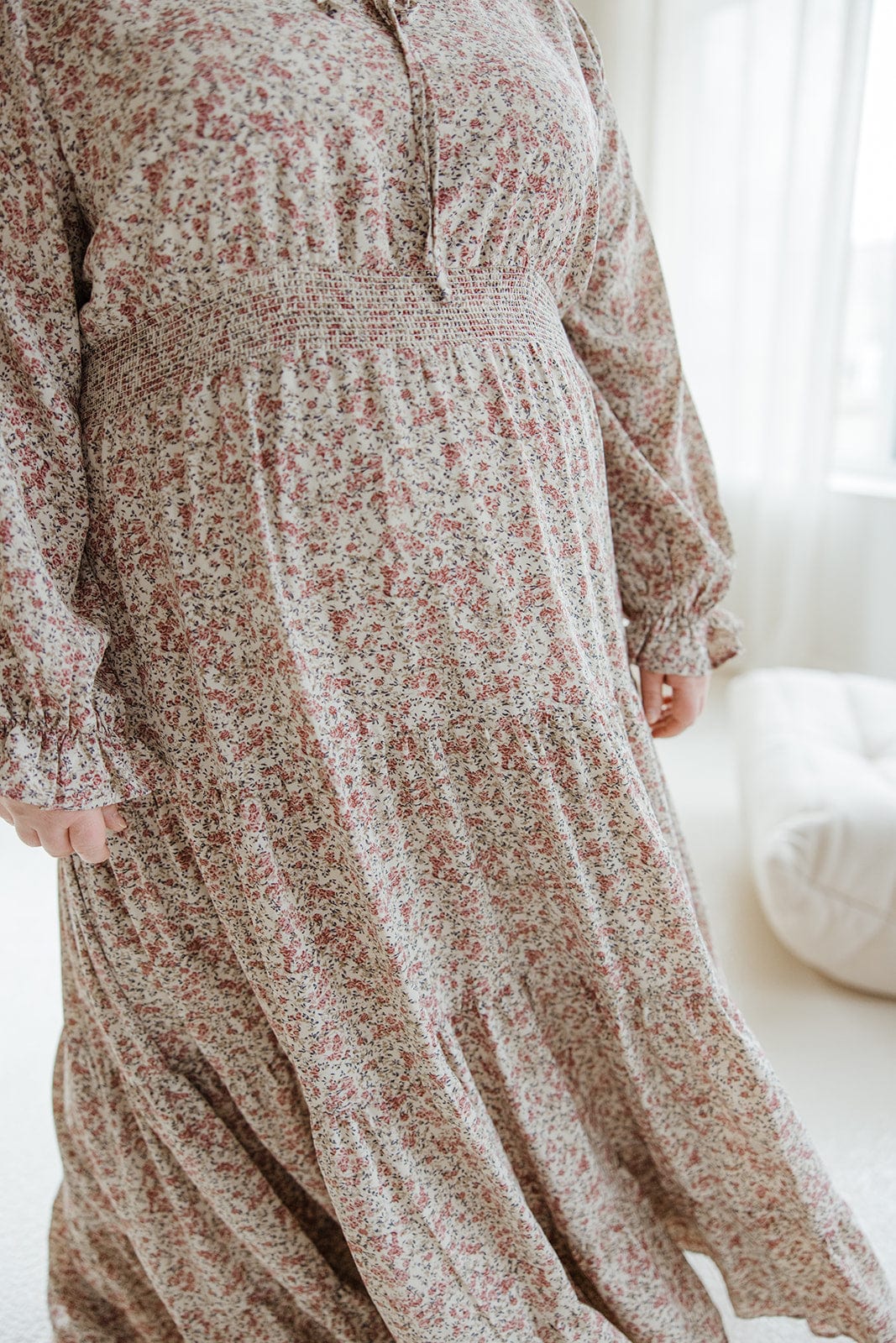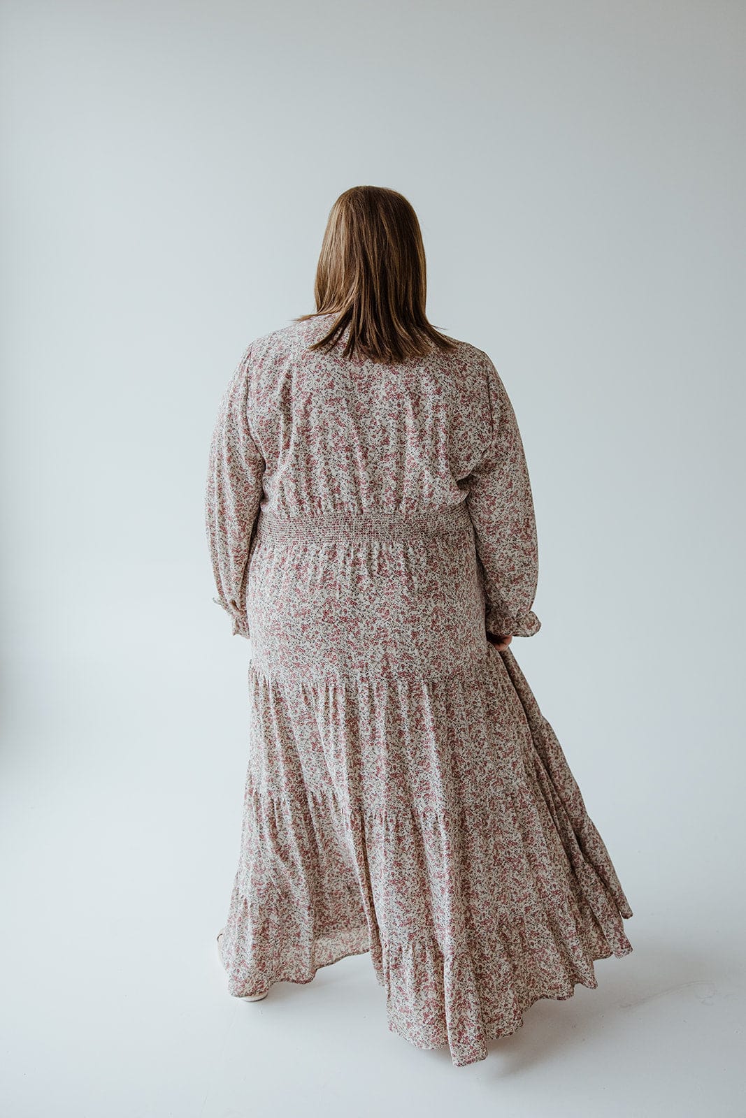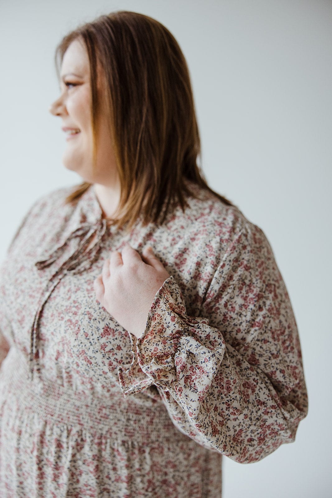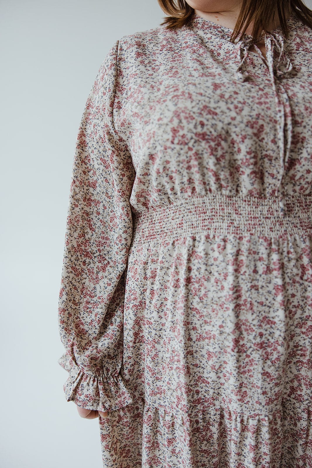 Twirl into effortless style with this boho midi dress. Featuring a playful tie neckline and smocked waist, the long blouson sleeves and tiered skirt add a touch of whimsy. In a charming micro-floral pattern, this dress is perfect for any occasion. (Hint: it's also great for twirling!) Fits true to size. We suggest going with your typical. Stacey is wearing a size 2x. Want more information about the model? Visit our Lovely Models page.