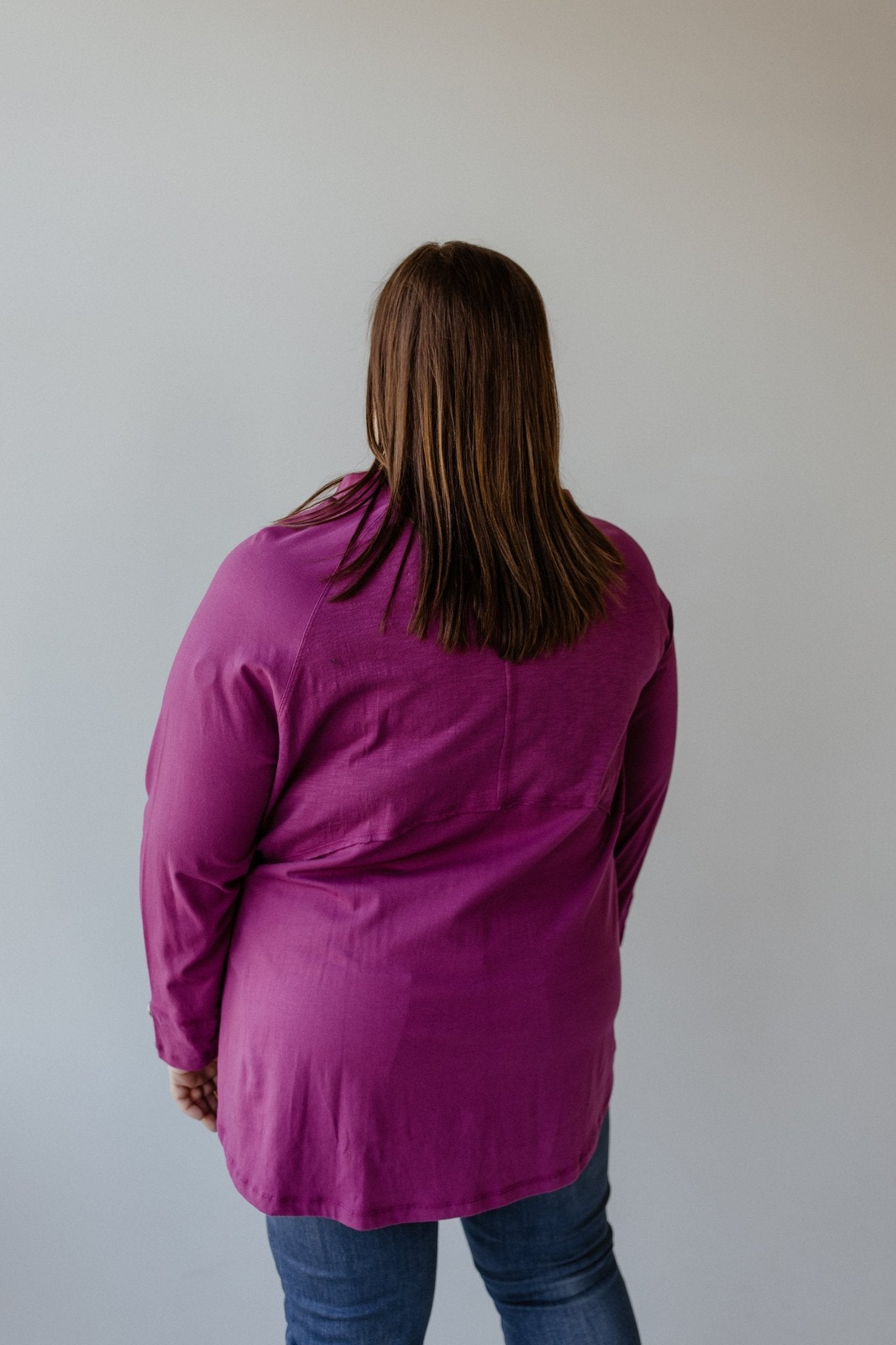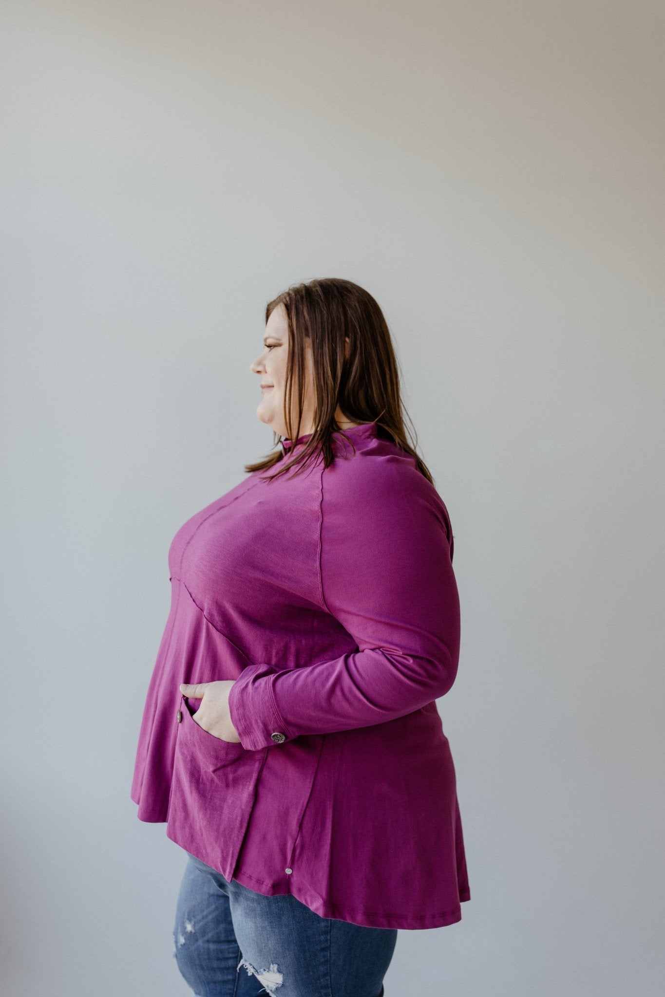 Slay the fashion game in this winter orchid Mock Cowl Neck Tunic! It features a mock cowl neck with button detail, empire waist seam, long sleeves and funky pockets with button detail. The back seam detail gives it a unique and stylish look, making you stand out from the crowd. Get ready to rock the look! Fits true to size. We suggest going with your typical size. Stacey wearing a size 3x. Want more information about the model? Visit our Lovely Models page.