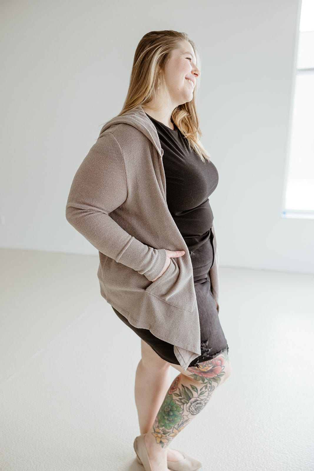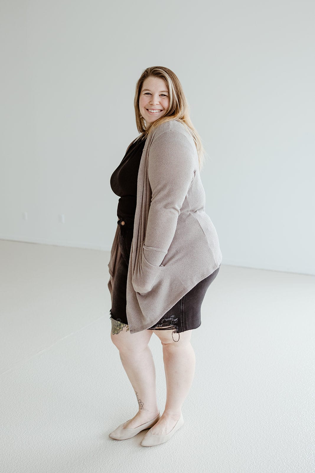 Get ready to cozy up in our OPEN FRONT THERMAL CARDIGAN. Made with oh-so-soft fabric, this cardigan is perfect for casual wear. The drape front and open front design add a touch of elegance, while the pockets provide convenience. Stay warm and comfortable all day long! Fits true to size. We suggest going with your typical size. Cara is wearing a size 3x. Want more information about the model? Visit our Lovely Models page.