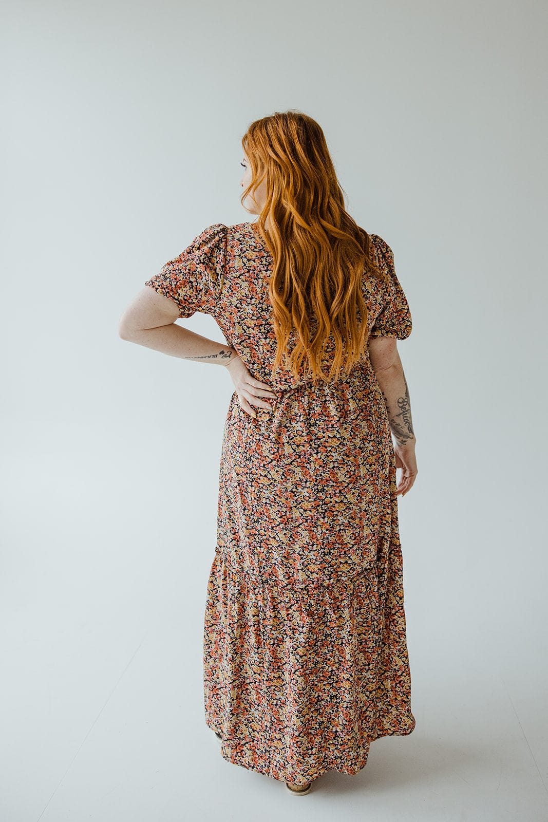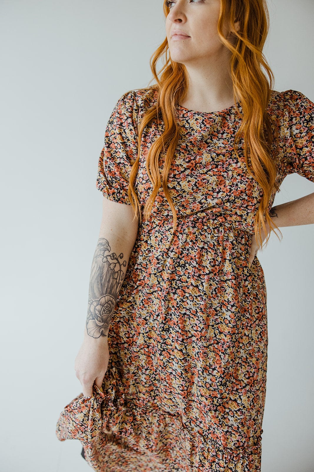 SCOOP NECK MIDI LENGTH DRESS WITH KICK HEM IN AUTUMN BOUQUET