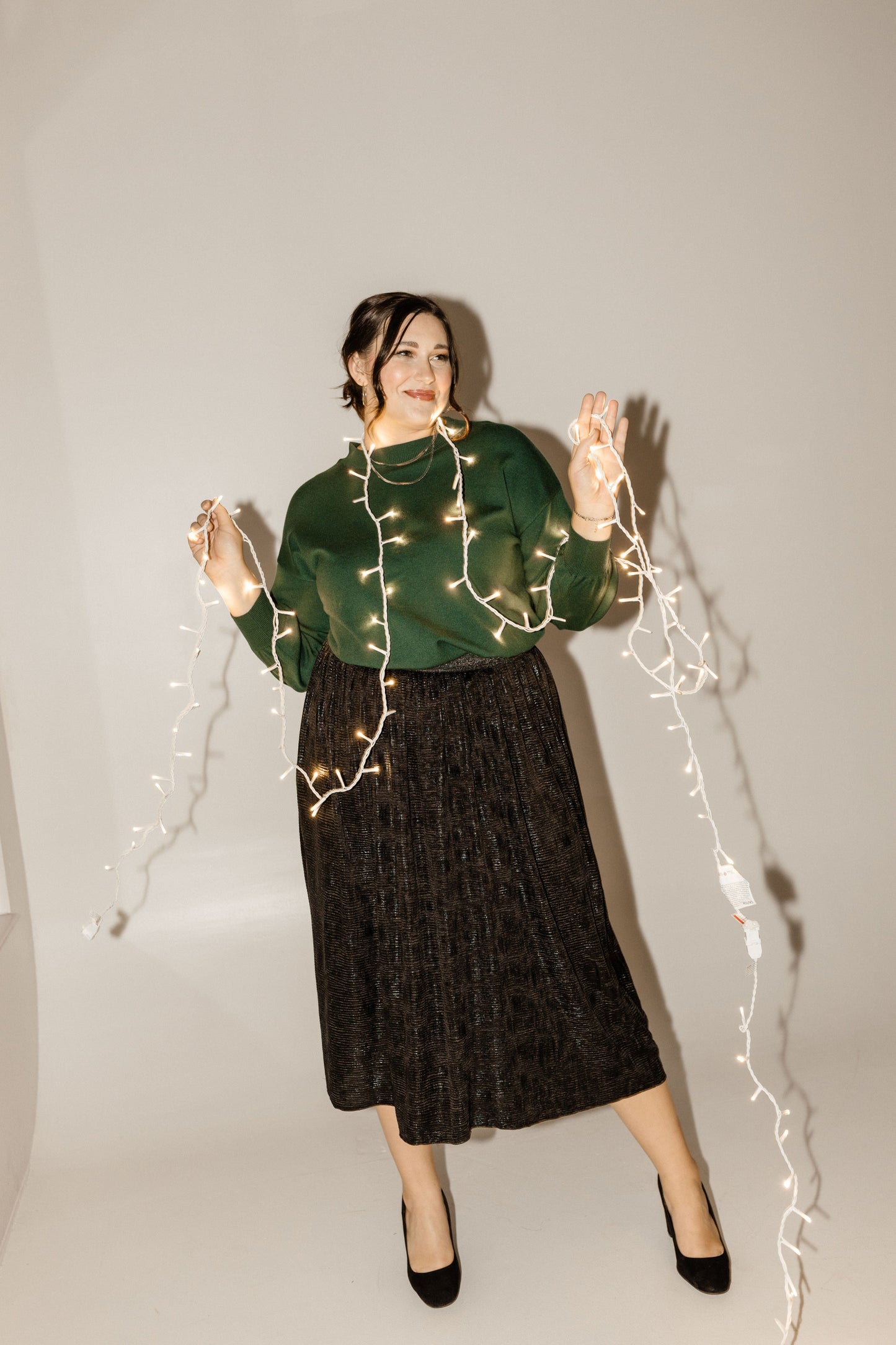 Meet the skirt that shines as bright as you do — the Shimmery Midi Length A-Line Skirt in Black from Love Marlow Boutique, where style meets confidence in every size.