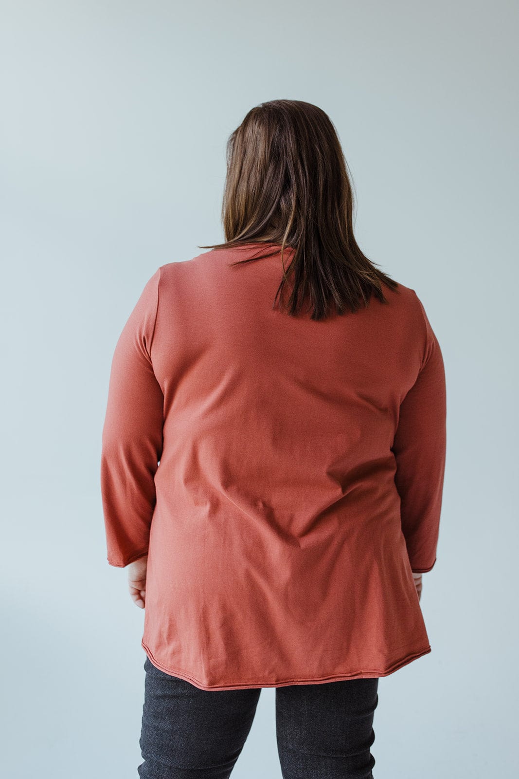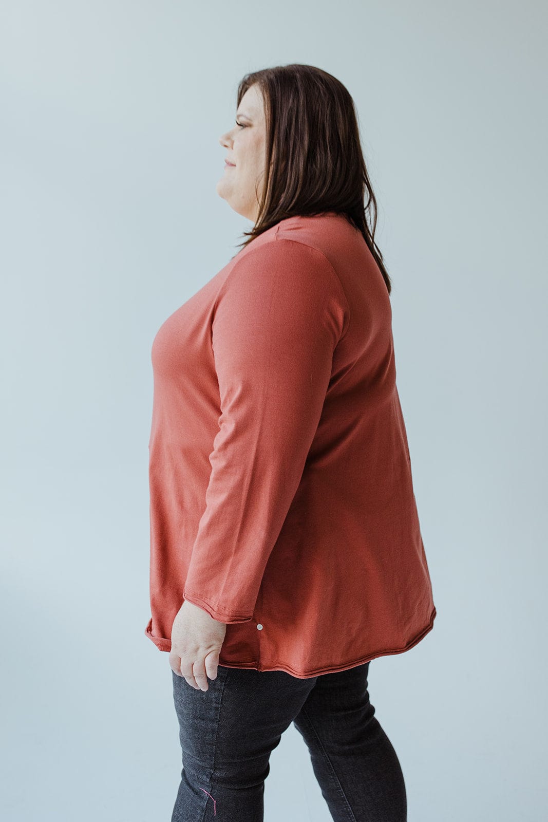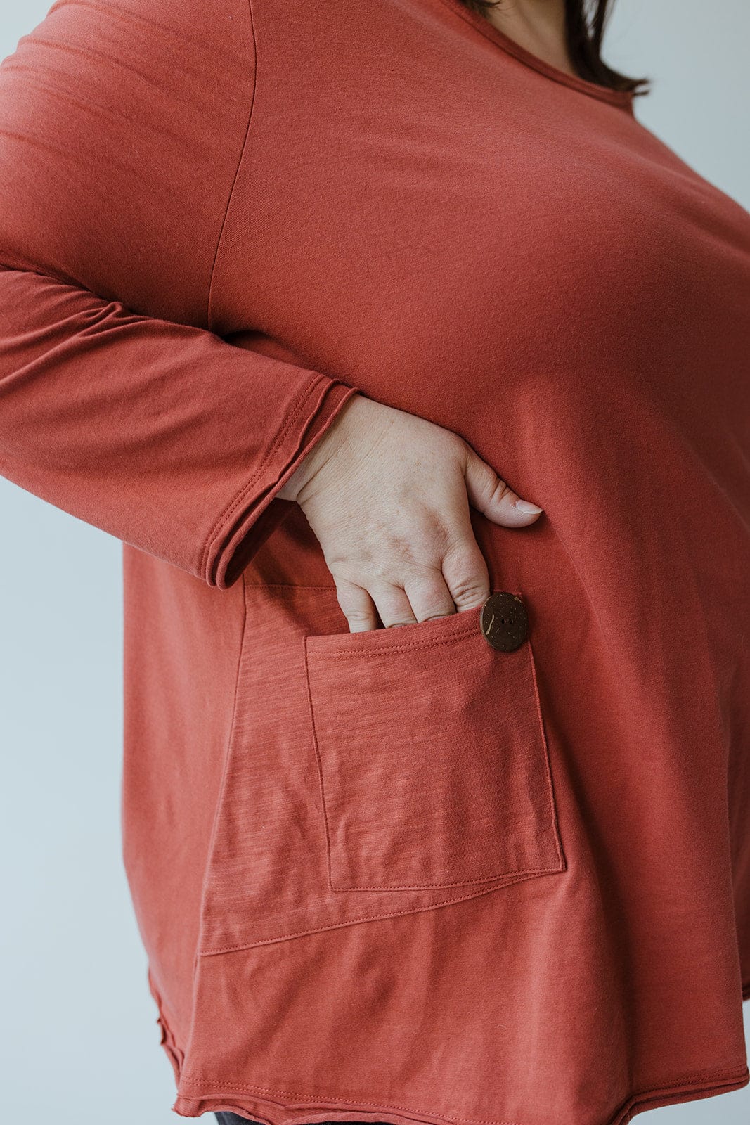 Meet your new favorite anything-but-basic mid to plus-size tunic. From the fun roasted cinnamon hue to the double raw hem on sleeves and hem this tee is all about the details! The material is lightweight and luxuriously supple to the touch, bringing this simple tunic to the next level of luxury. It is not a tee that is going to wear out after a couple of uses. We haven't even gotten to the best part yet! Check out the fun pocket made out of textured fabric! The hemline is slightly longer in the back, so this tee will be perfect to pair with jeans, leggings, or even tuck into a skirt! It has amazing full-length sleeves that will be perfect for any season! Fits true to size.