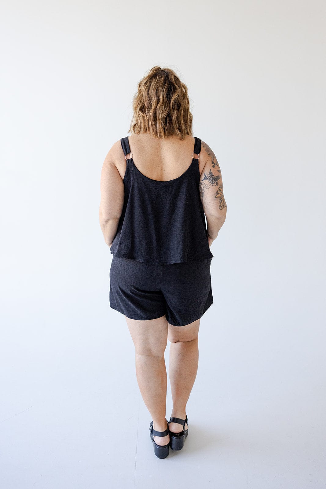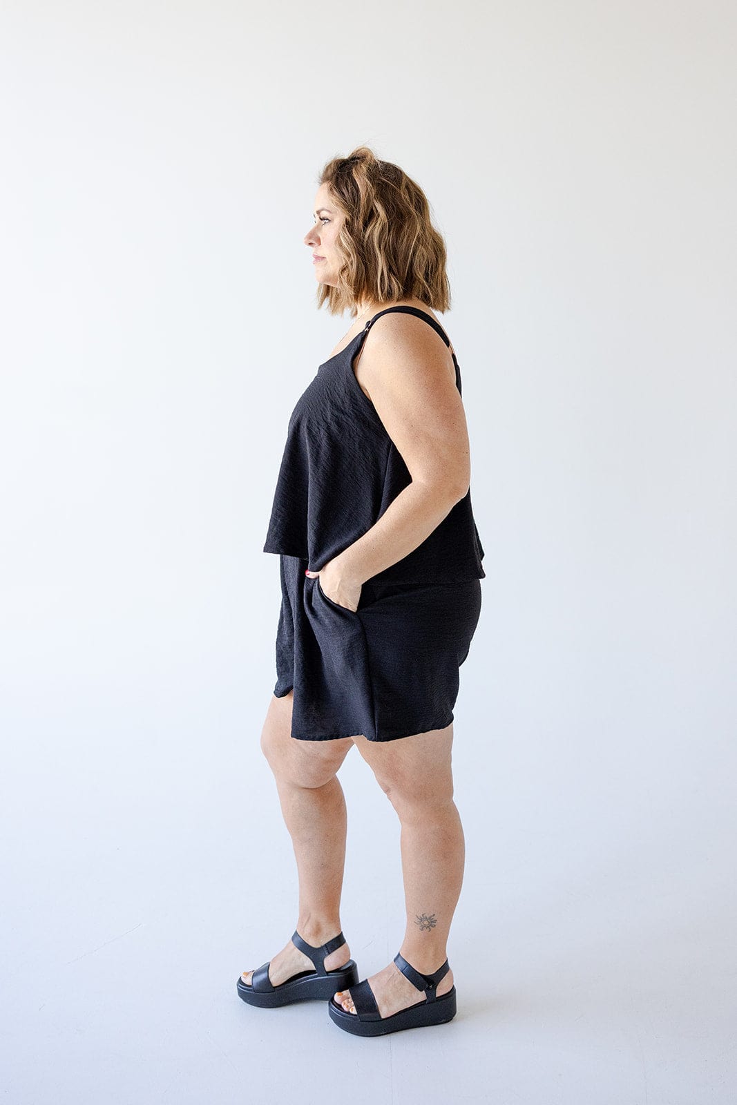 Get ready for summer fun in this lightweight romper with a scoop neckline and adjustable wide straps. The loose, relaxed fit allows for maximum comfort, while the pockets add both style and convenience. Stay cool and stylish all season long in this flattering textured romper. Fits true to size. We suggest going with your typical size. Misty is wearing a size 1x. Want more information about the model? Visit our Lovely Models page.