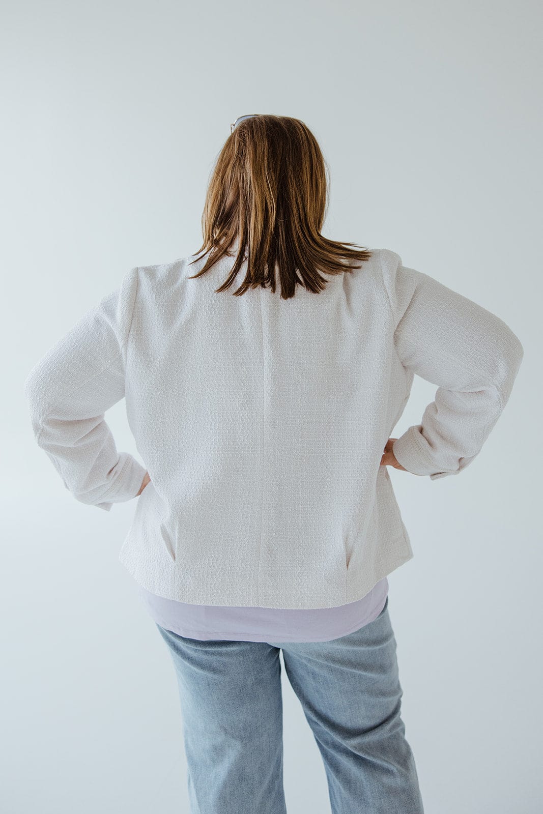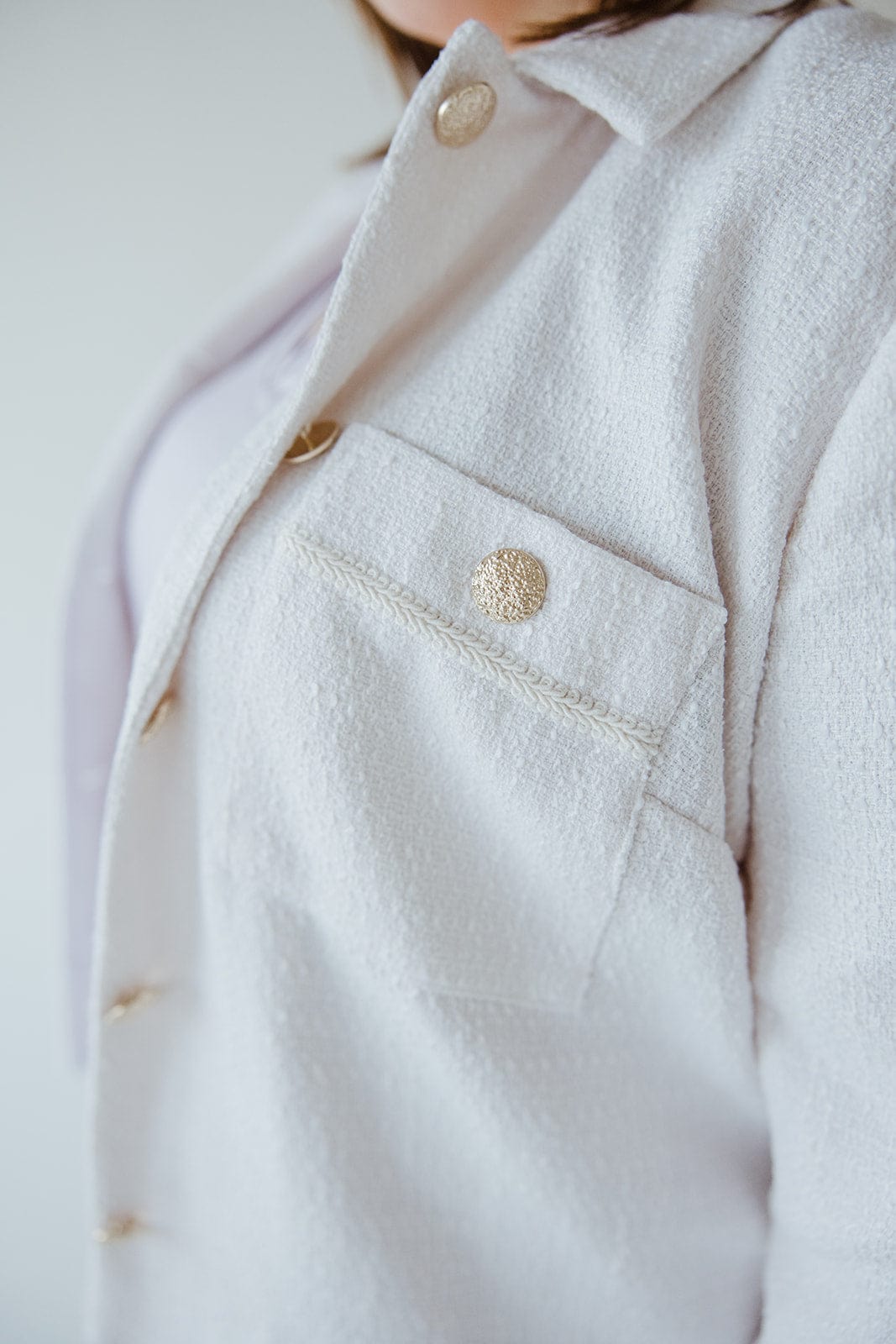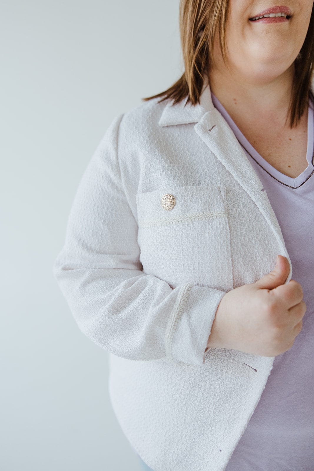 Elevate your style with our TWEED JACKET IN ECRU. Inspired by Jacqueline Kennedy Onassis, this modern jacket boasts exquisite brocade detailing and elegant gold buttons. Perfect for any occasion, it epitomizes sophisticated and timeless fashion. Fits true to size. We suggest going with your typical size. The jacket does not have much stretch through the shoulders and arms. If you need a little more room in the shoulders and arms, we suggest going up a size. Stacey is wearing a size 2x. Want more information about the model? Visit our Lovely Models page.