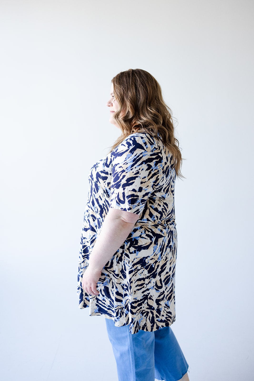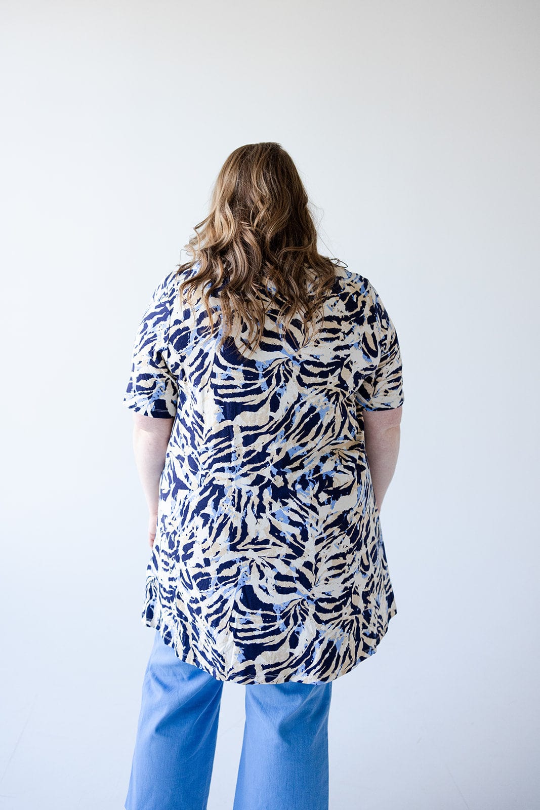 This V-NECK ABSTRACT PALM PRINT TUNIC is crafted from a luxurious fabric and features a classic v-neck design with a great long tunic length, perfect for an effortlessly laid-back look. The fun abstract palm print, set in a range of classic colors with pops of deep cobalt and sky blue, adds a touch of style and flair. Fits true to size. We suggest going with your typical size. Leslie is wearing a size 18. Want more information about the model? Visit our Lovely Models page.