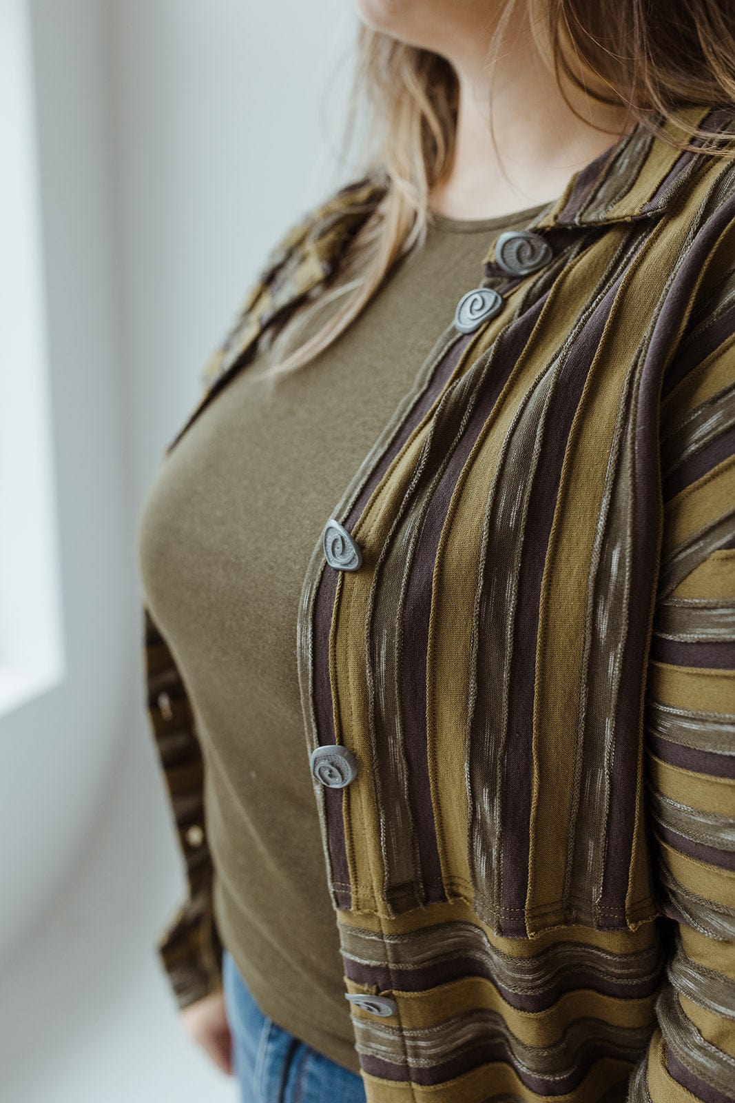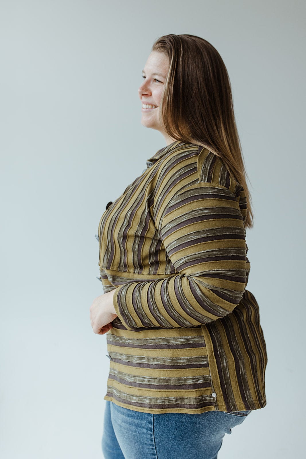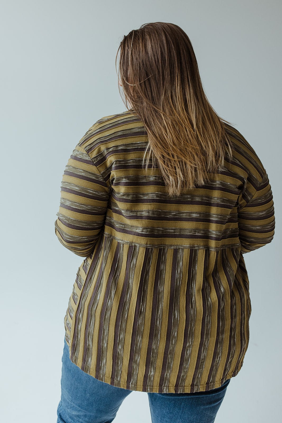 This VARYING STRIPE BUTTON-UP BLOUSE in Kale will be sure to turn heads. Its bold stripes and sophisticated buttons show off your unique style, while the collar and pocket keep you looking chic and comfortable. Up your wardrobe game with this head-turning blouse! It fits true to size if you intend to wear it open. If you are planning to wear it closed, we suggest sizing up. We suggest going with your typical size. Cara is wearing a size 3x. Want more information about the model? Visit our Lovely Models page.