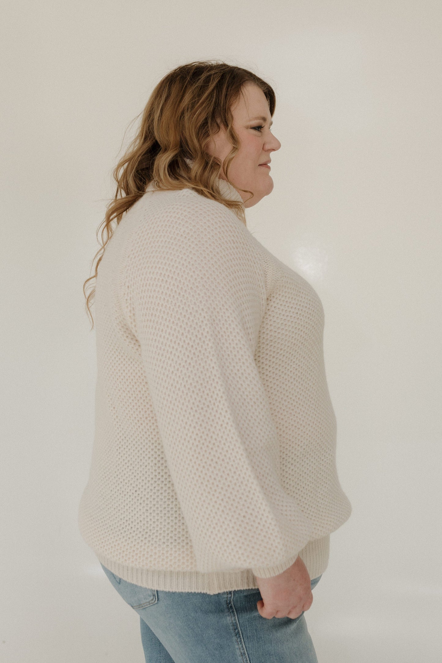 The ribbed turtleneck adds warmth without bulk, while the raglan sleeves and voluminous blouson cuffs create an elegant silhouette that drapes beautifully on sizes 12–24. Its snow-white shade brings a fresh, modern feel to any winter wardrobe and pairs effortlessly with denim, trousers, or holiday-ready skirts.