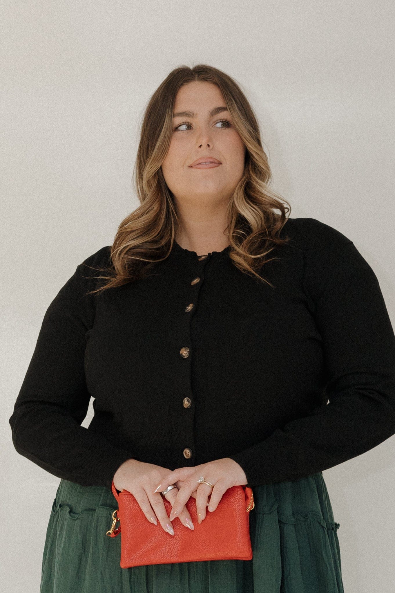 Meet the Essential Button Front Cardigan in Black—a timeless layering piece every mid-size and plus-size wardrobe needs. Designed with a classic crew neckline, full-length sleeves, and a flattering length that sits just above the hip, this lightweight cardigan offers the perfect blend of polish and comfort.