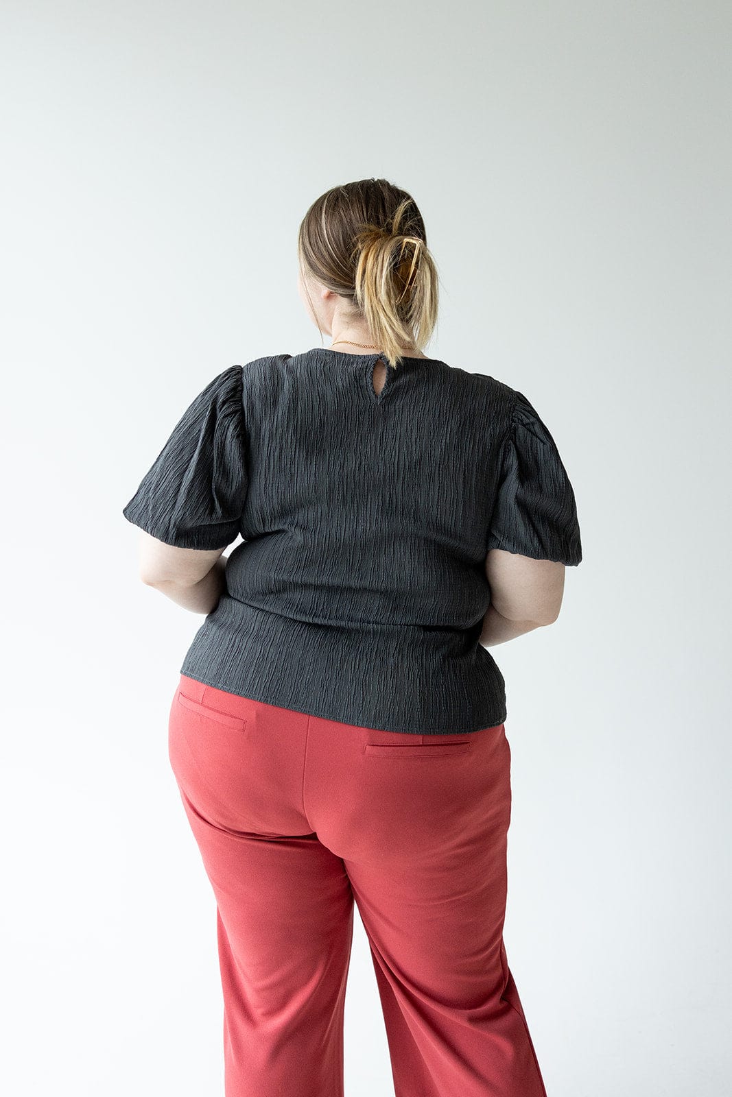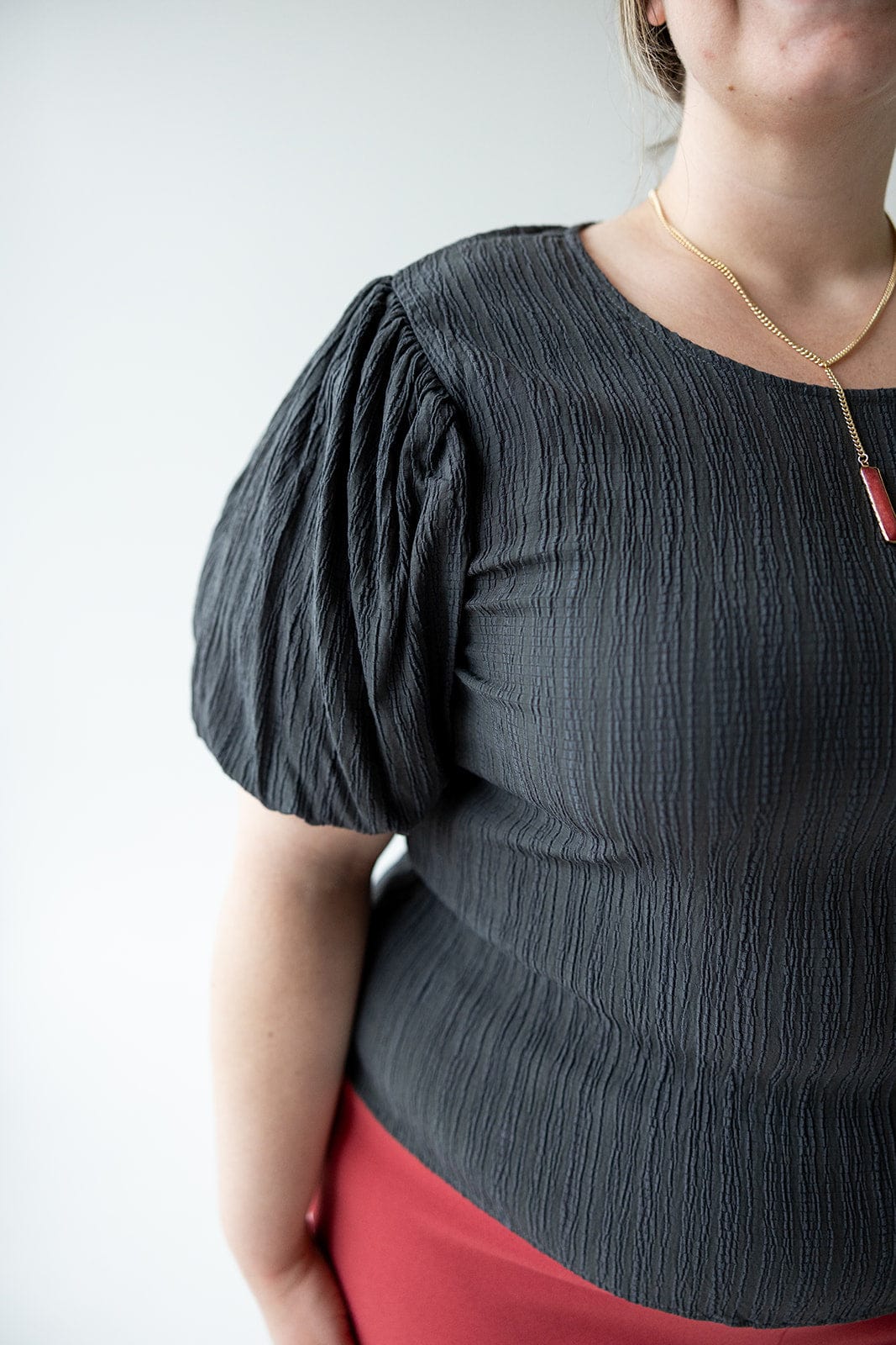 TEXTURED LONG CROP BLOUSE WITH BUBBLE SLEEVE IN LEAD