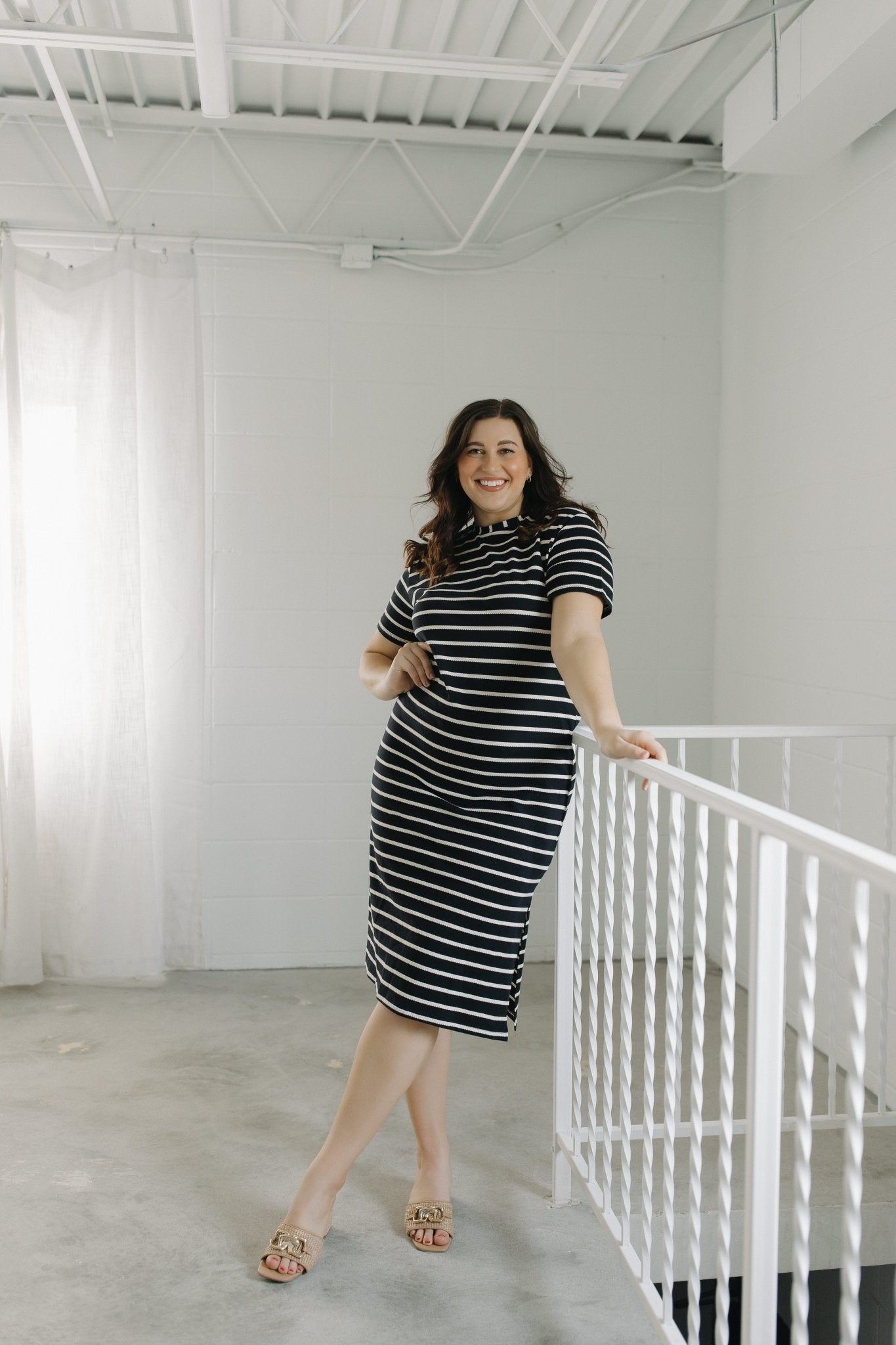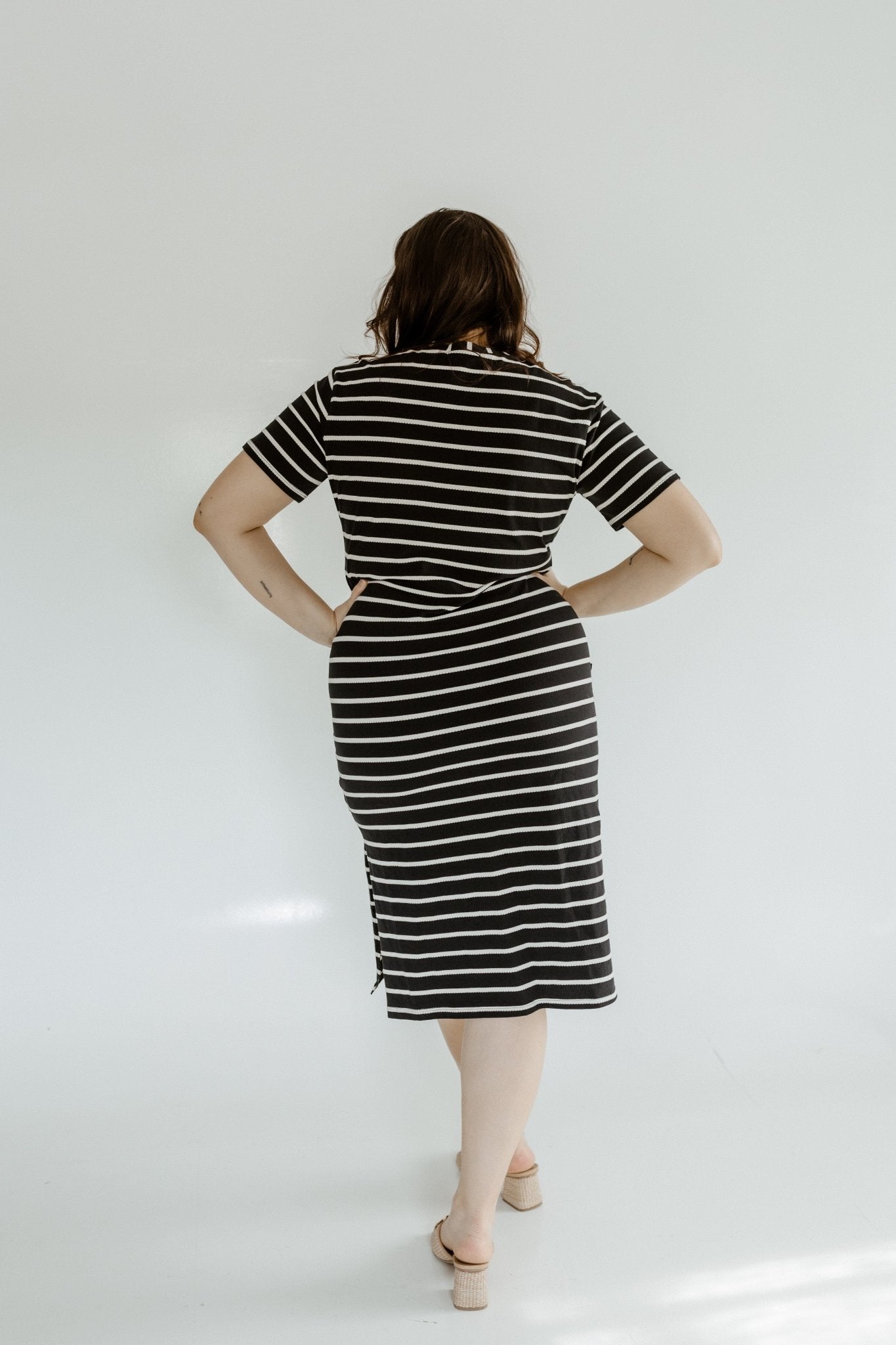 Crafted from ultra-soft 100% cotton, this midi dress features a classic crew neckline, curve-hugging bodycon fit, and a chic side slit for easy wear. The textured ivory stripe against a black base gives a modern, elevated twist to your favorite t-shirt silhouette—perfect for dressing up or down.