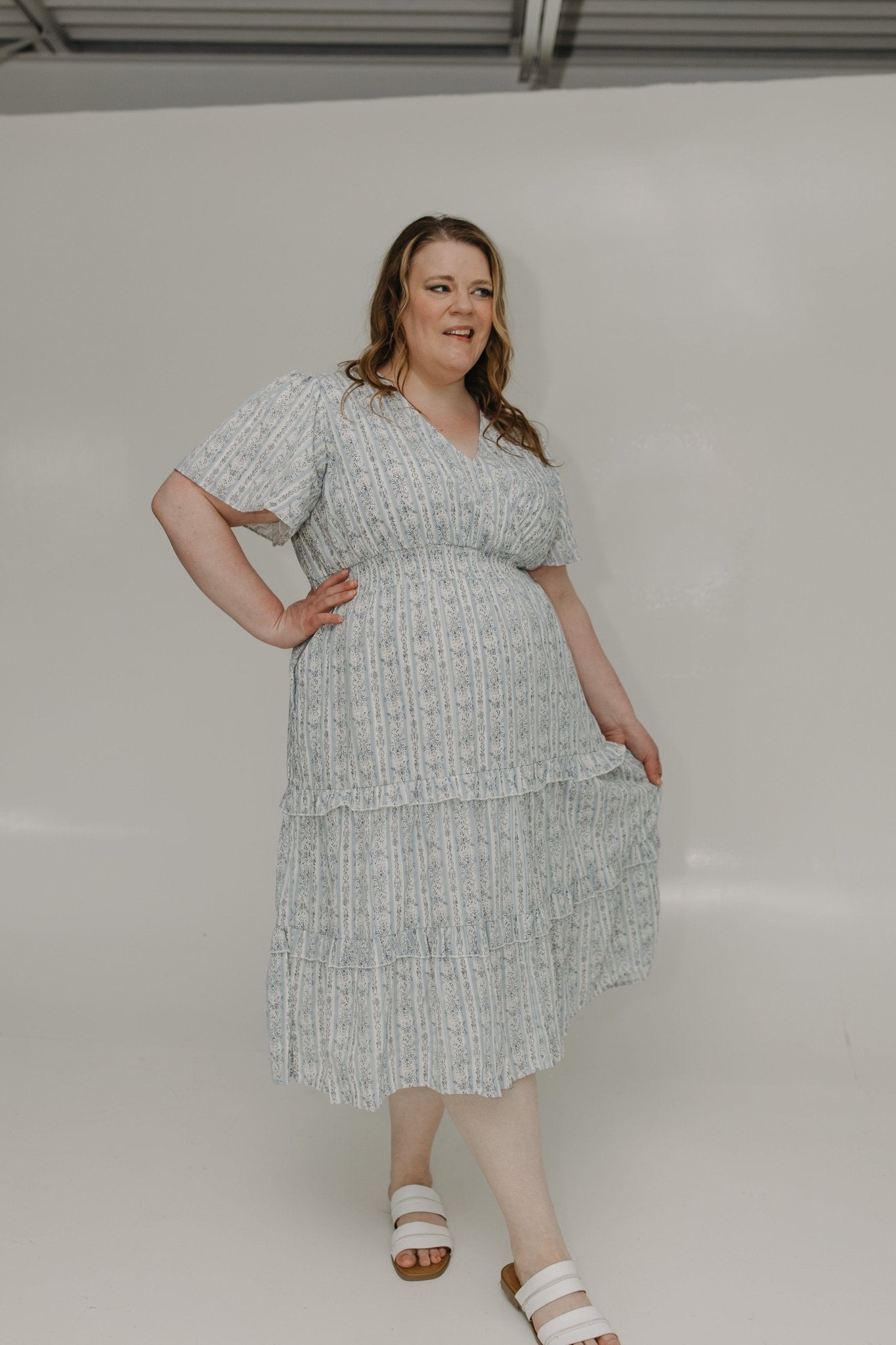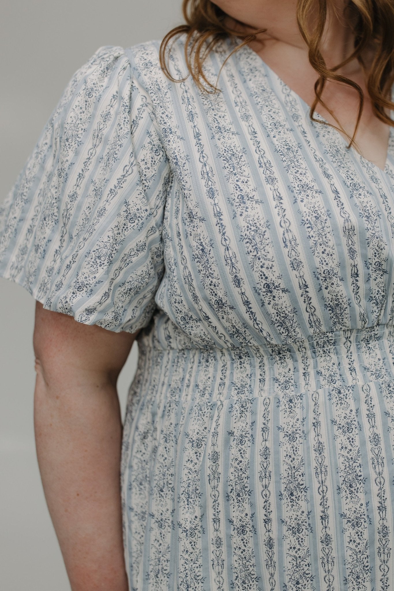 Crafted in a soft blue linear print, this piece feels romantic, breathable, and perfectly polished for everything from brunch to spring events.