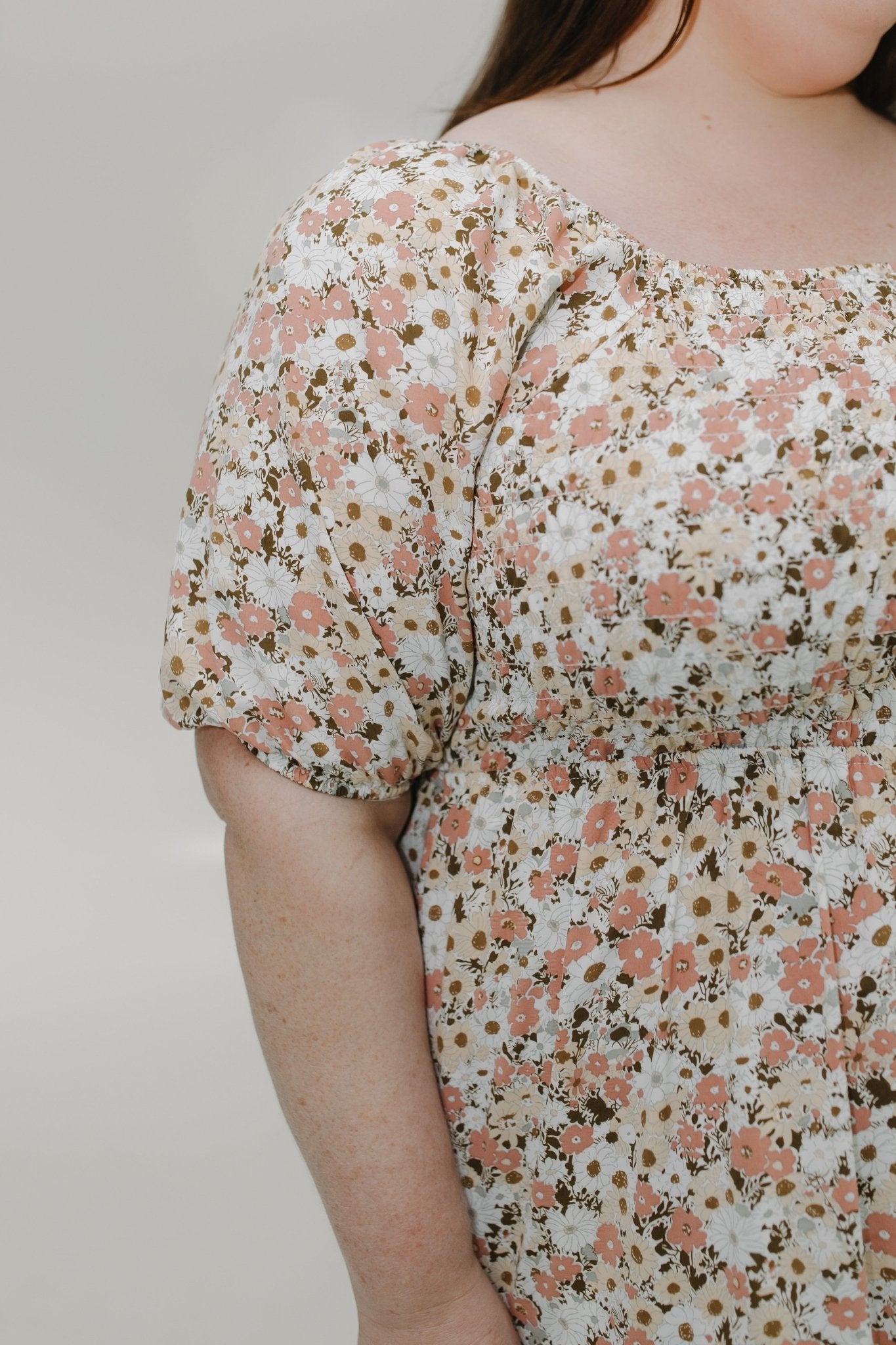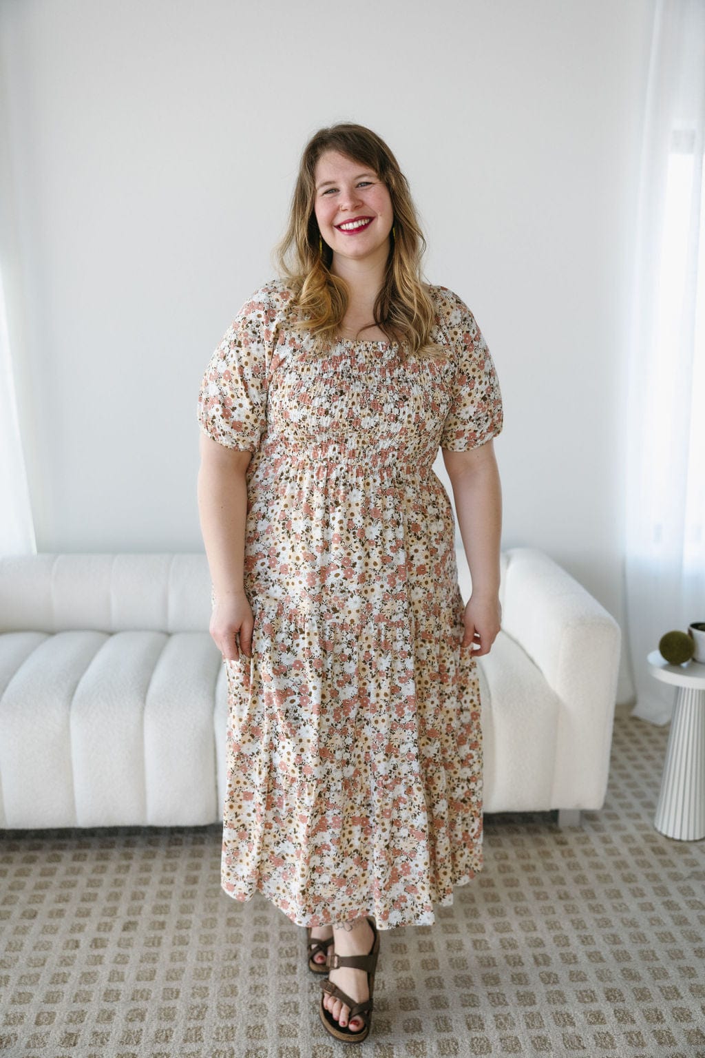 The slight scoop neckline and bubble sleeves add a touch of romantic charm, while the smocked bodice provides a comfortable, curve-hugging fit. The tiered skirt flows beautifully, creating a graceful silhouette with every step. Plus, with hidden pockets and a fully lined design, this dress is as practical as it is chic.