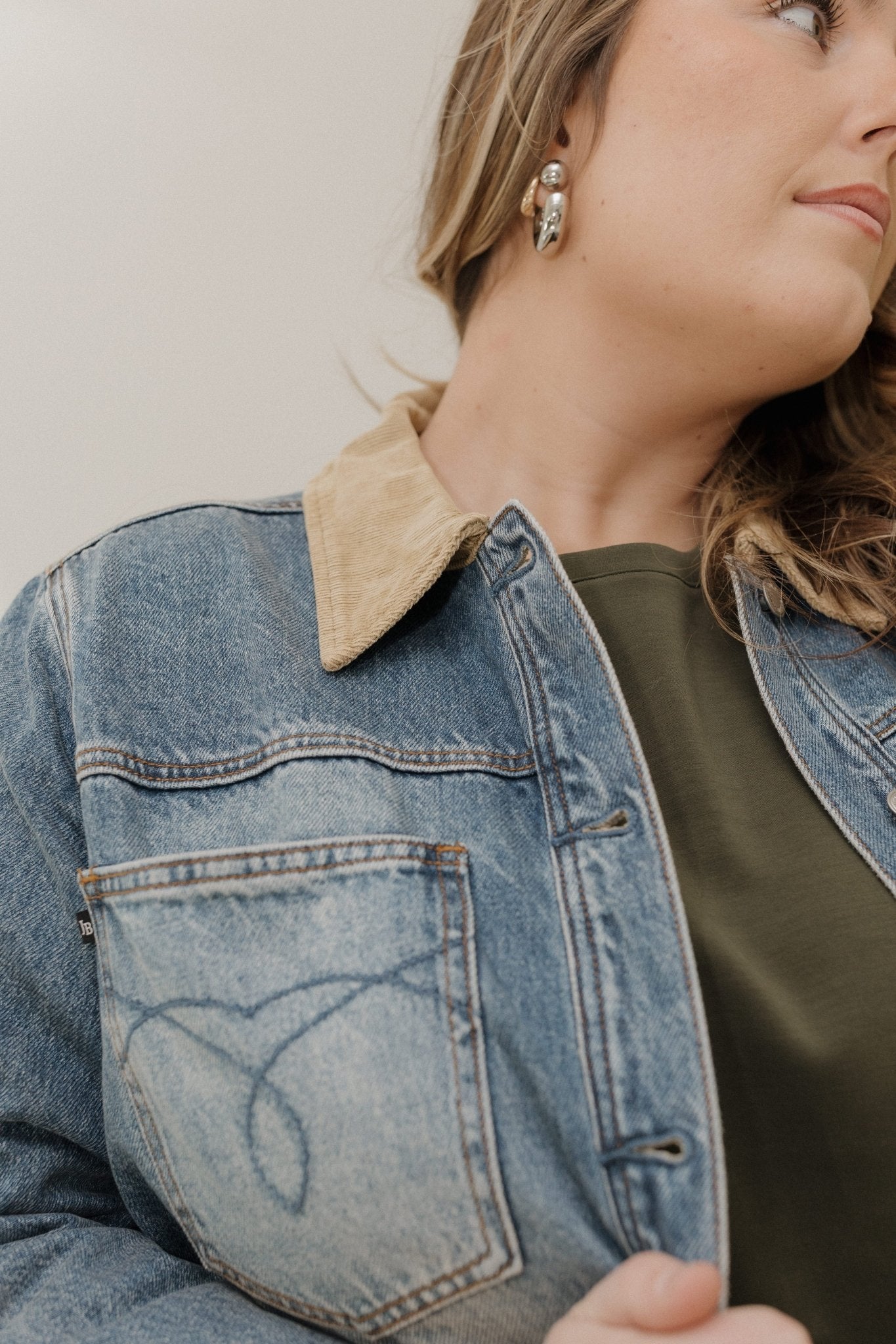- Corduroy collar adds timeless contrast and texture