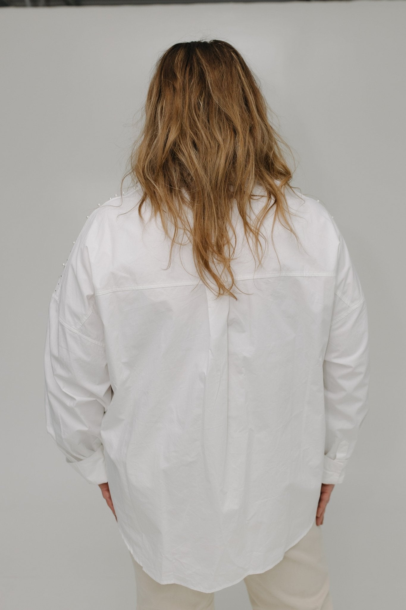 Made from crisp, breathable 100% cotton, this beauty features a polished collar, front button closure, and long sleeves you can roll or cuff. The box pleat in the back gives it that relaxed-but-refined fit you love—just enough shape, never clingy. The creamy hue keeps it ultra-versatile, while the sparkle brings the drama.