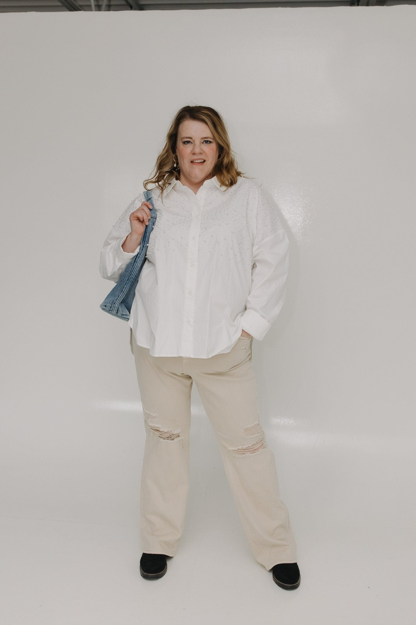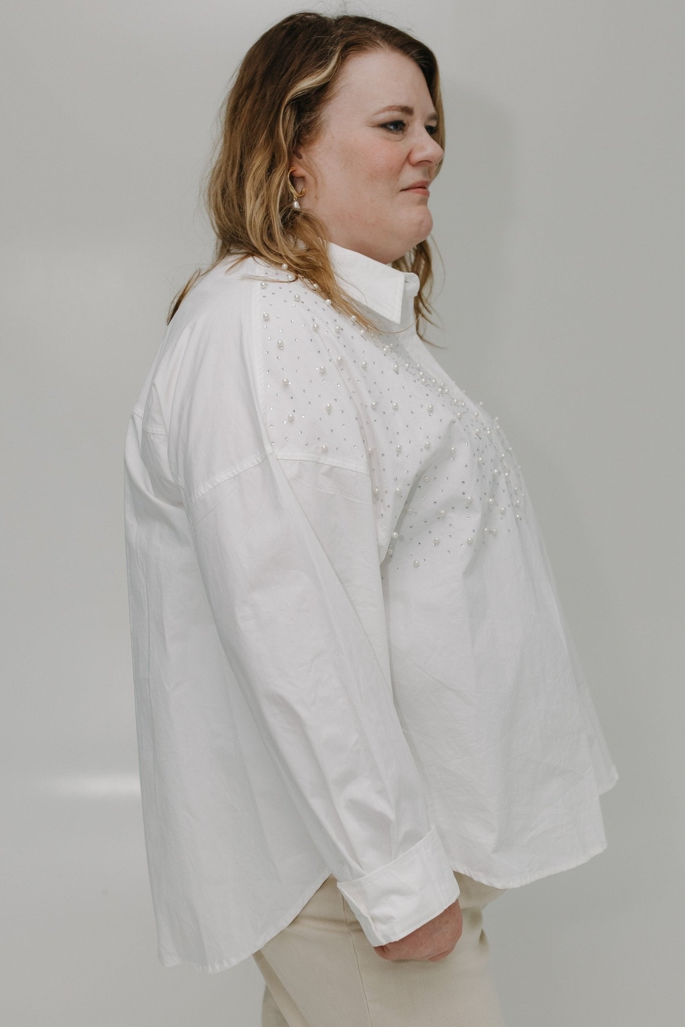 It’s giving cowgirl couture—and we’re obsessed. This Classic Button-Up with Pearls and Sparkles takes the timeless button-up silhouette and cranks the style all the way up with dazzling pearl and crystal embellishments from the shoulders to the bust.