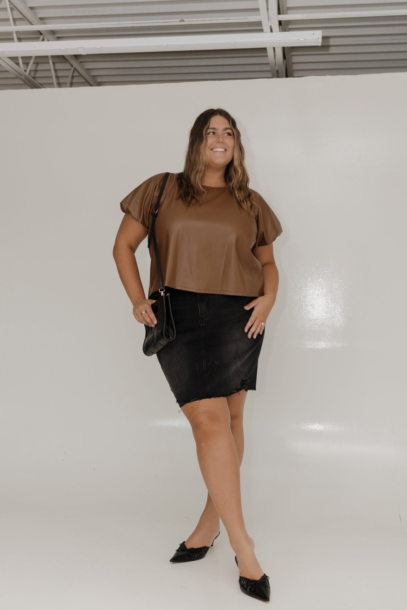 Meet your new statement piece — the Faux Leather Puff Sleeve Blouse in Caramel. Crafted from luxe faux leather in a rich, warm brown shade, this top blends edgy texture with feminine charm. Designed with a classic crew neckline, short raglan puff sleeves, and a keyhole back closure, it offers a flattering silhouette that hits right at the hip. Perfect for adding a touch of sophistication to your everyday looks.