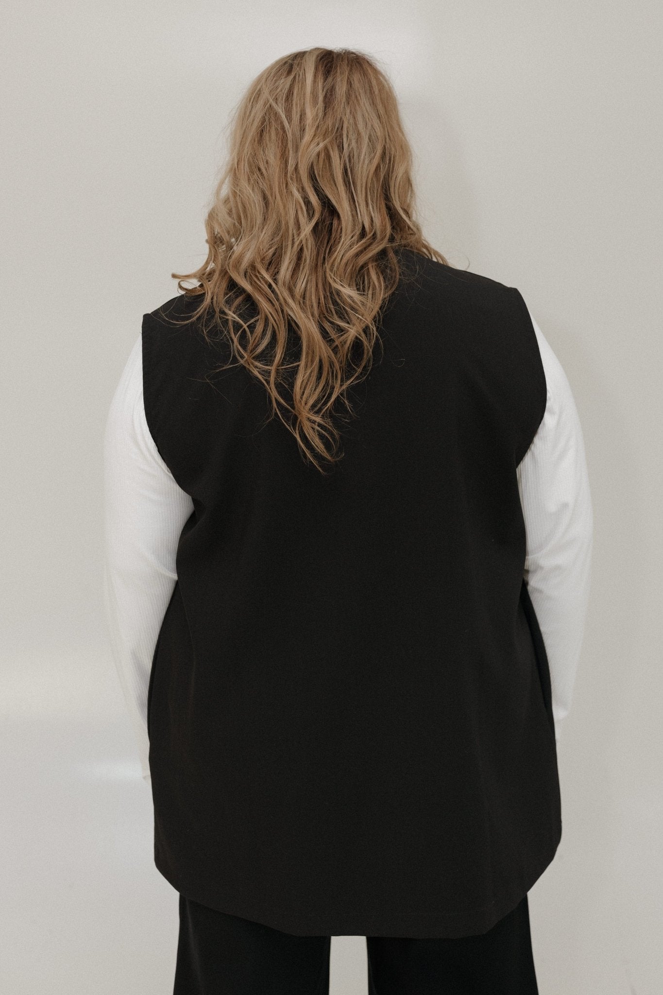 Effortlessly elevate your look with the Sleeveless Blazer Vest in Black — a timeless layering piece designed for modern, confident women. This lightweight woven vest blazer features an open front, side pockets, and a relaxed fit that drapes beautifully over any outfit. The rounded lapel and faux flap pocket details add a polished touch, making it perfect for workwear, weekend brunch, or an elevated casual look.