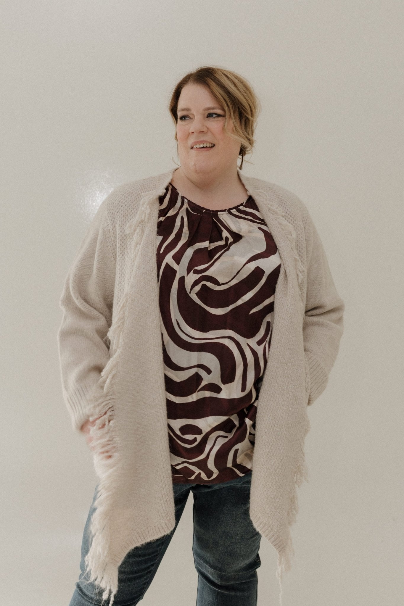 - Soft, flowy fabric in a striking wine & cream abstract print