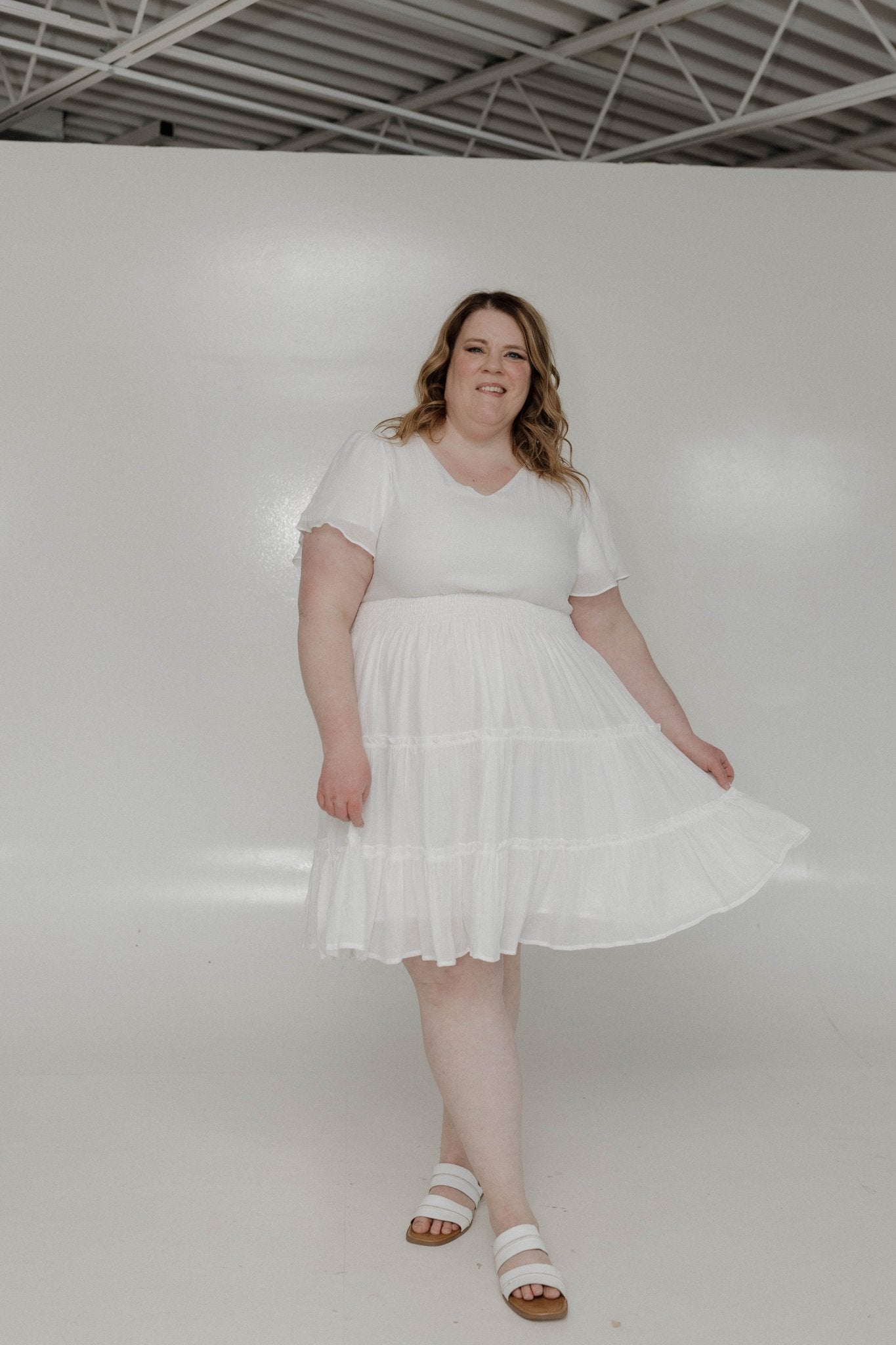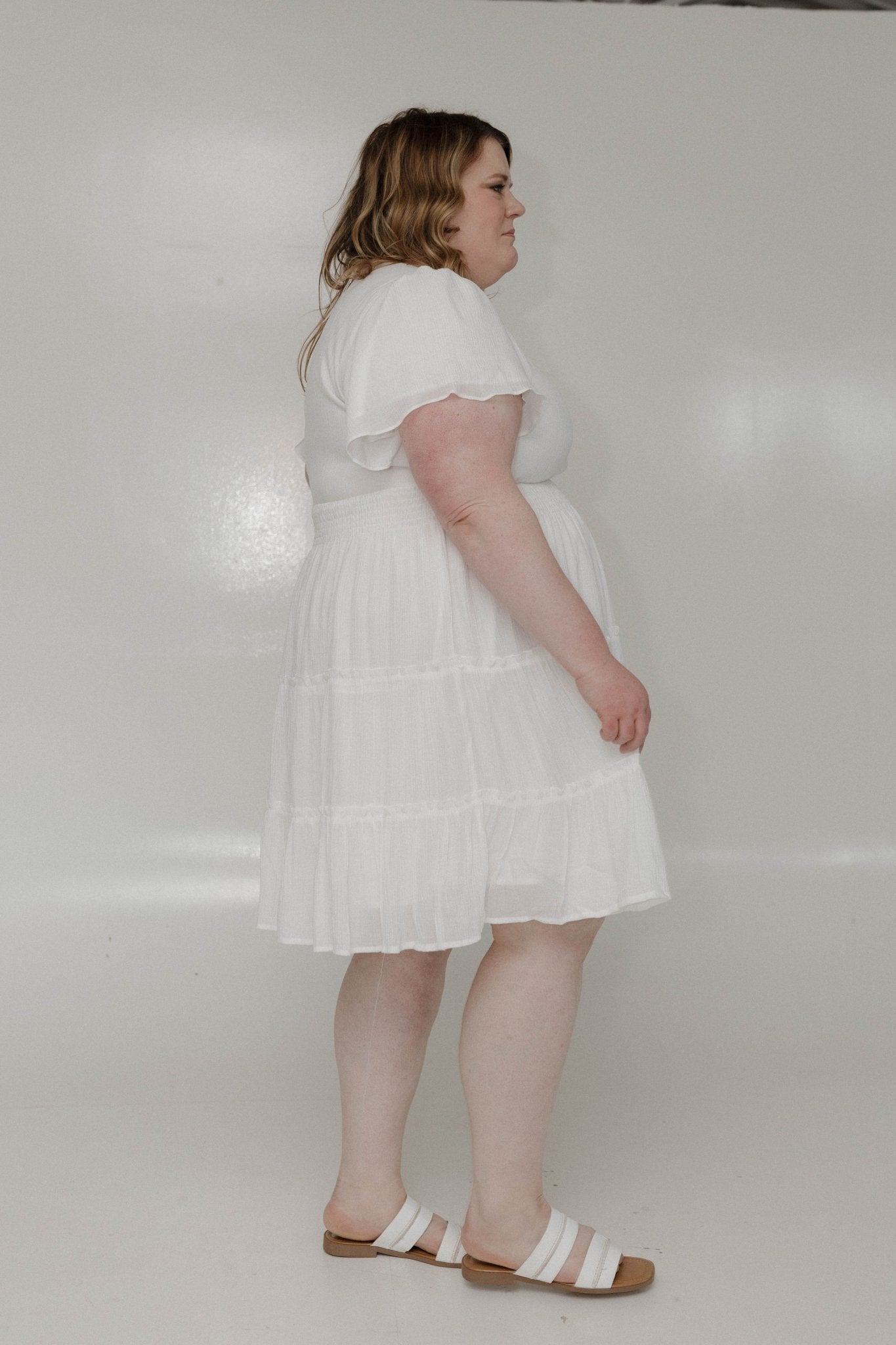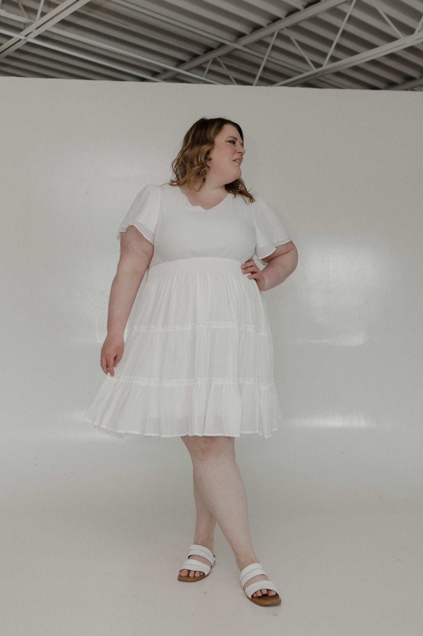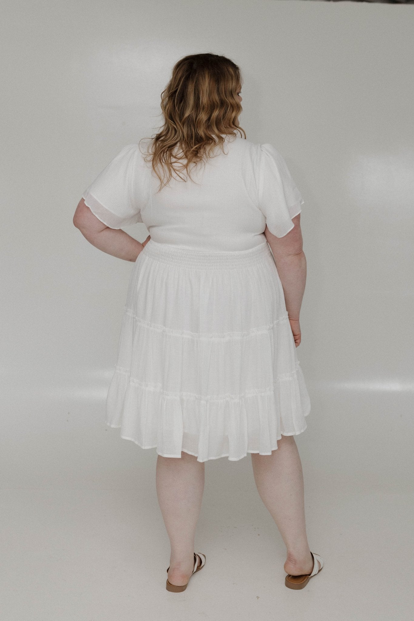 Meet your new go-to midi dress. The Midi-Length Tiered Flutter Sleeve Dress – Cotton is designed for mid-size and plus-size women who want flowy, flattering style with structure. Featuring a modest V-neckline, fluttery short sleeves, a smocked waist, and a tiered skirt edged with delicate ruffles, this dress accentuates your curves while providing structure to this extra flowy silhouette. Fully lined for confidence, it’s perfect for date nights, weddings, work events, or layering with a jean jacket, blazer, or faux leather jacket.