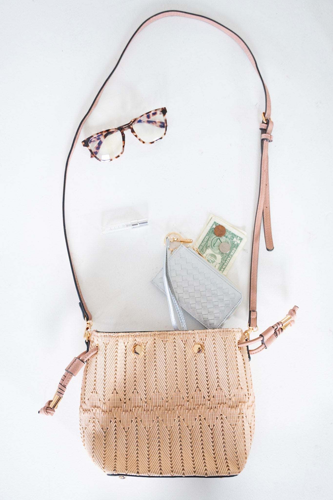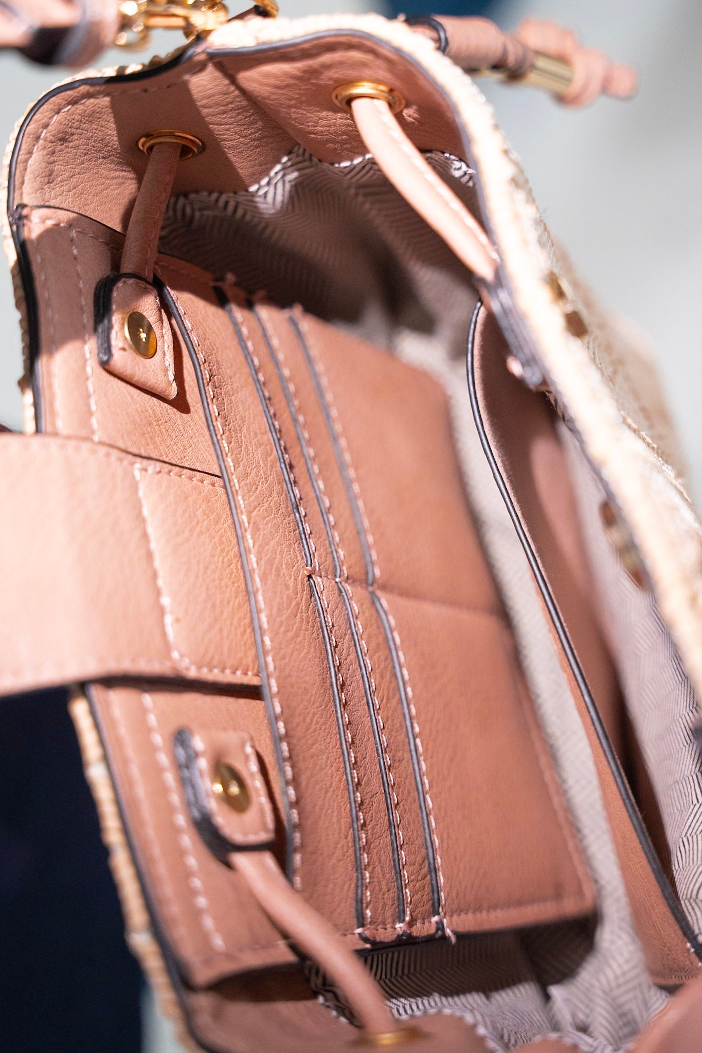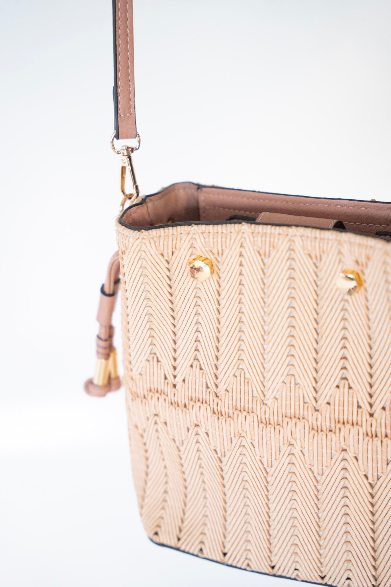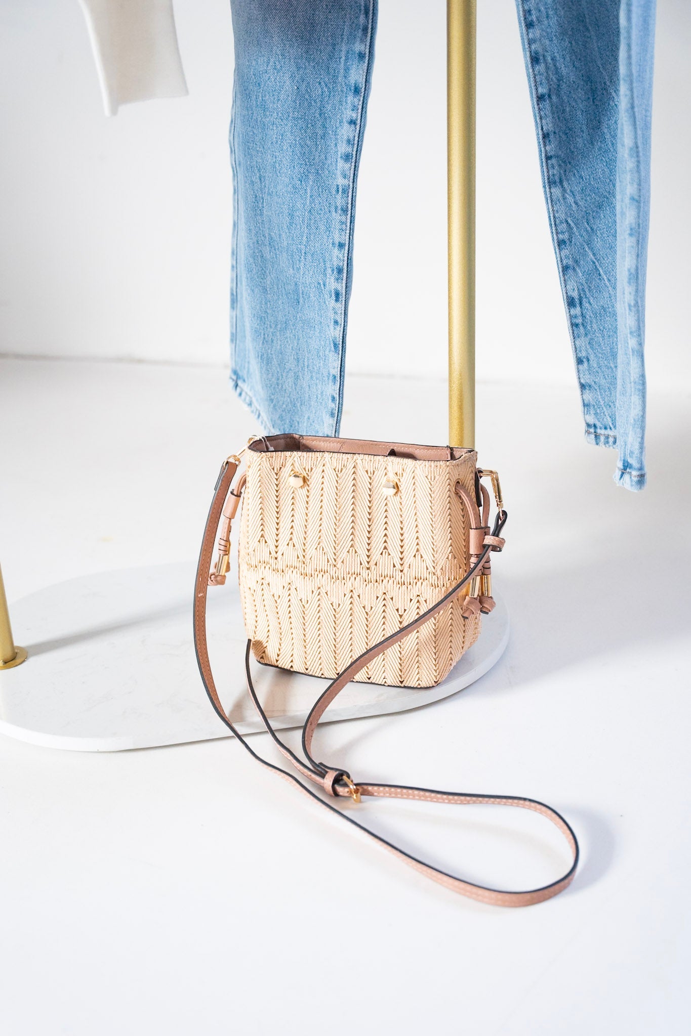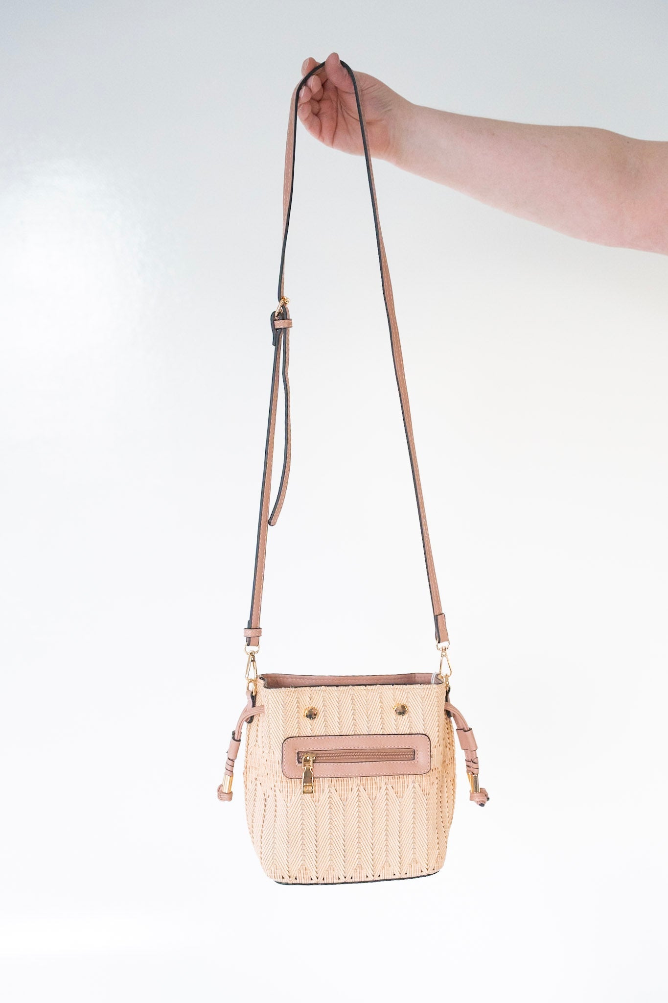 This chic MINI WOVEN BUCKET BAG IN BLUSH is the perfect accessory for any look. With a side drawstring finished with beautiful gold hardware accents, it's sure to make a statement. Plus, its woven fabric, adjustable and detachable strap make it versatile and easy to take from day to night without missing a beat!