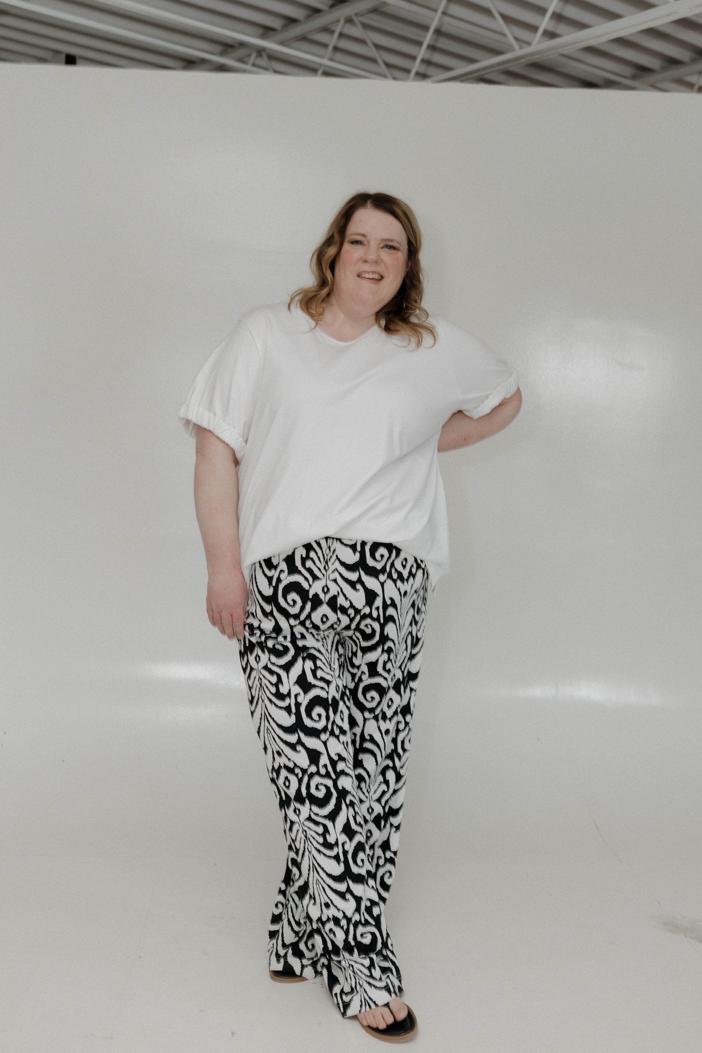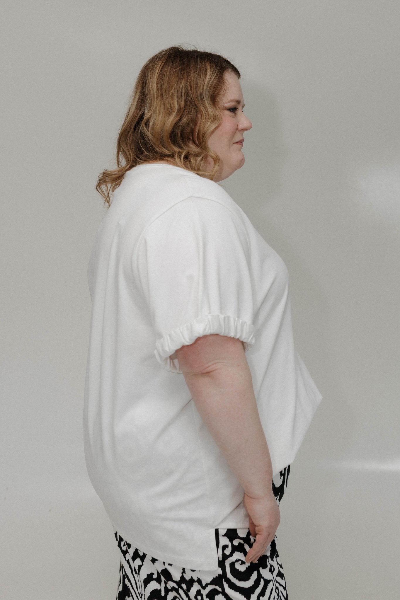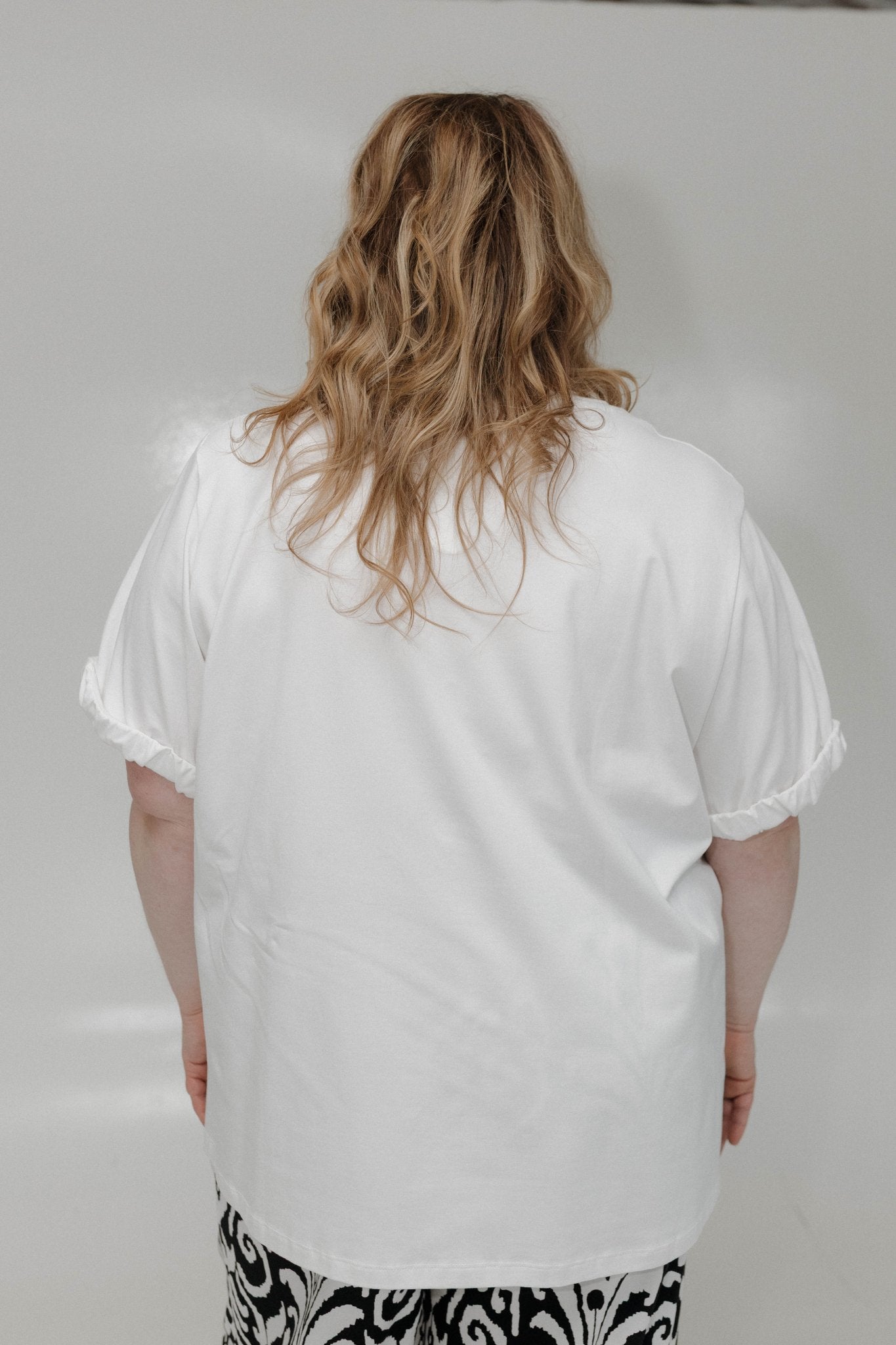 Elevate your everyday wardrobe with the Rolled Sleeve Tee in Off White. Designed for mid-size and plus-size women, this versatile tee combines comfort and style with a flattering crew neckline, rolled sleeves for a touch of sophistication, and side slits at the hem for a polished, easy fit. Perfect for layering or wearing on its own, this tee brings effortless luxury to your casual wardrobe.