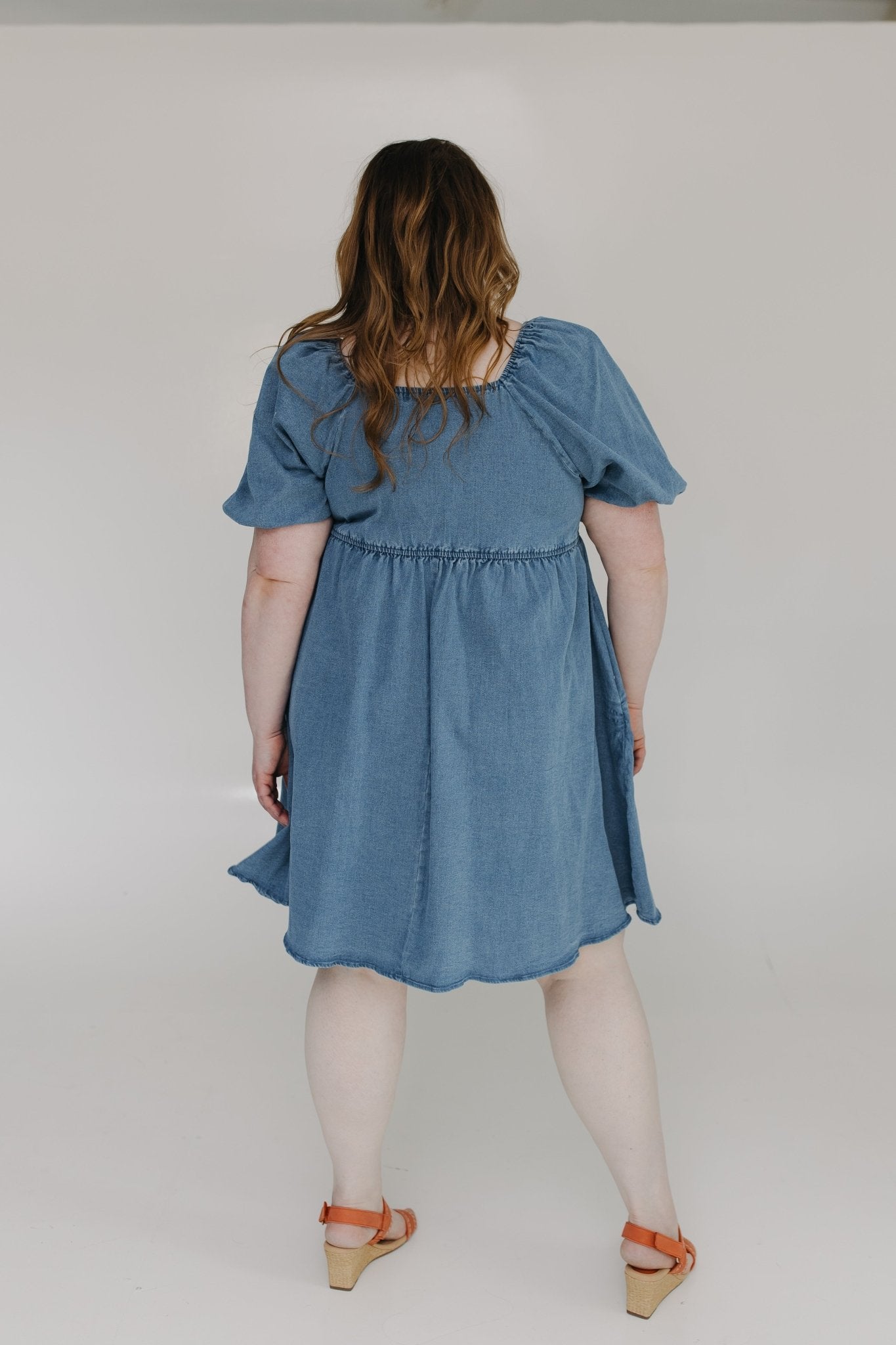 Meet your new favorite denim dress. The Bubble Sleeve Denim Dress – Dark Medium Wash is designed for mid-size and plus-size women who want effortless comfort with a feminine edge. Featuring a slight scoop neckline, statement bubble sleeves, and a stretchy waistline, this dress creates a flattering silhouette without feeling restrictive.