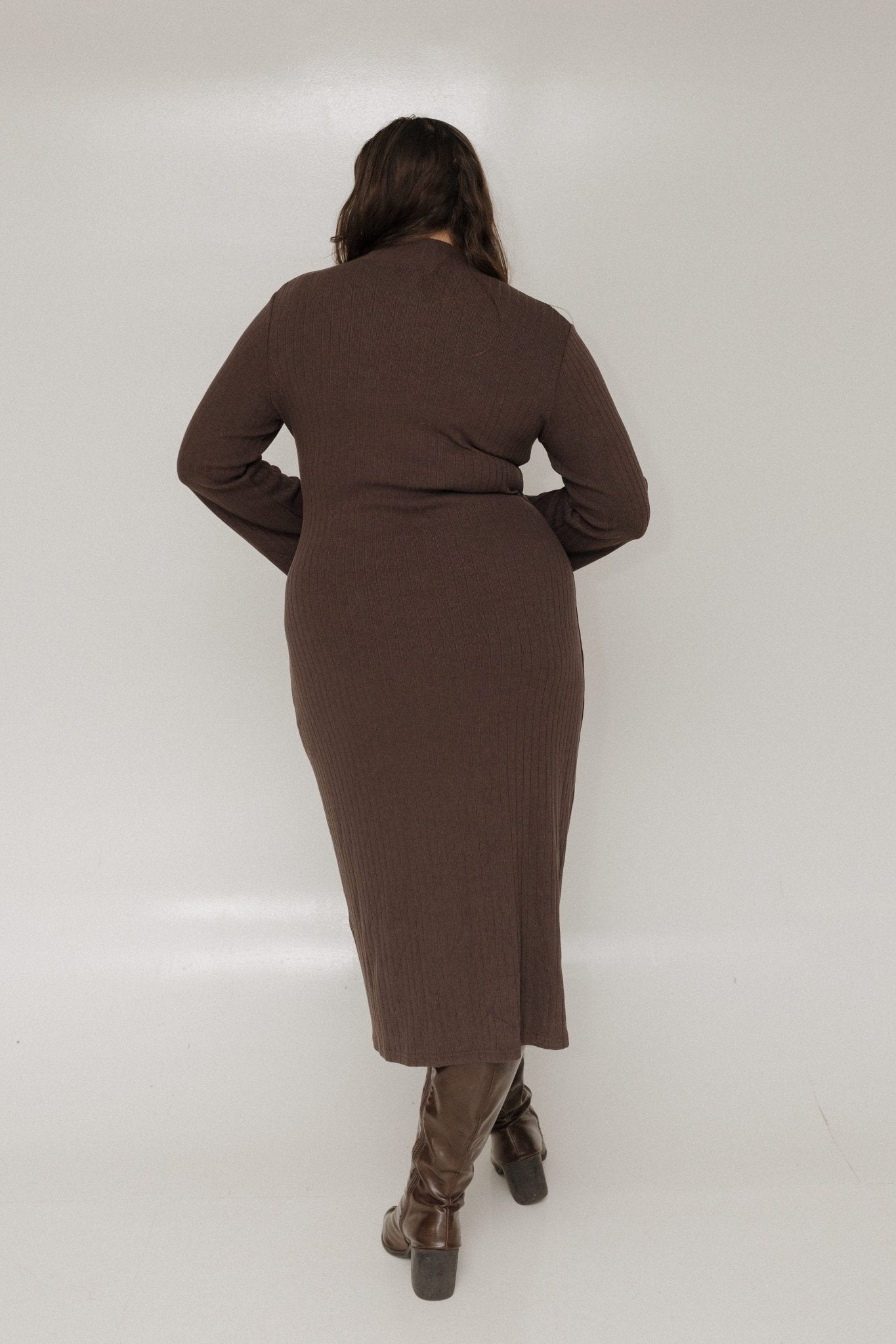 RIBBED LONG-SLEEVE TURTLENCK SWEATER MAXI DRESS IN WEATHERED BARK