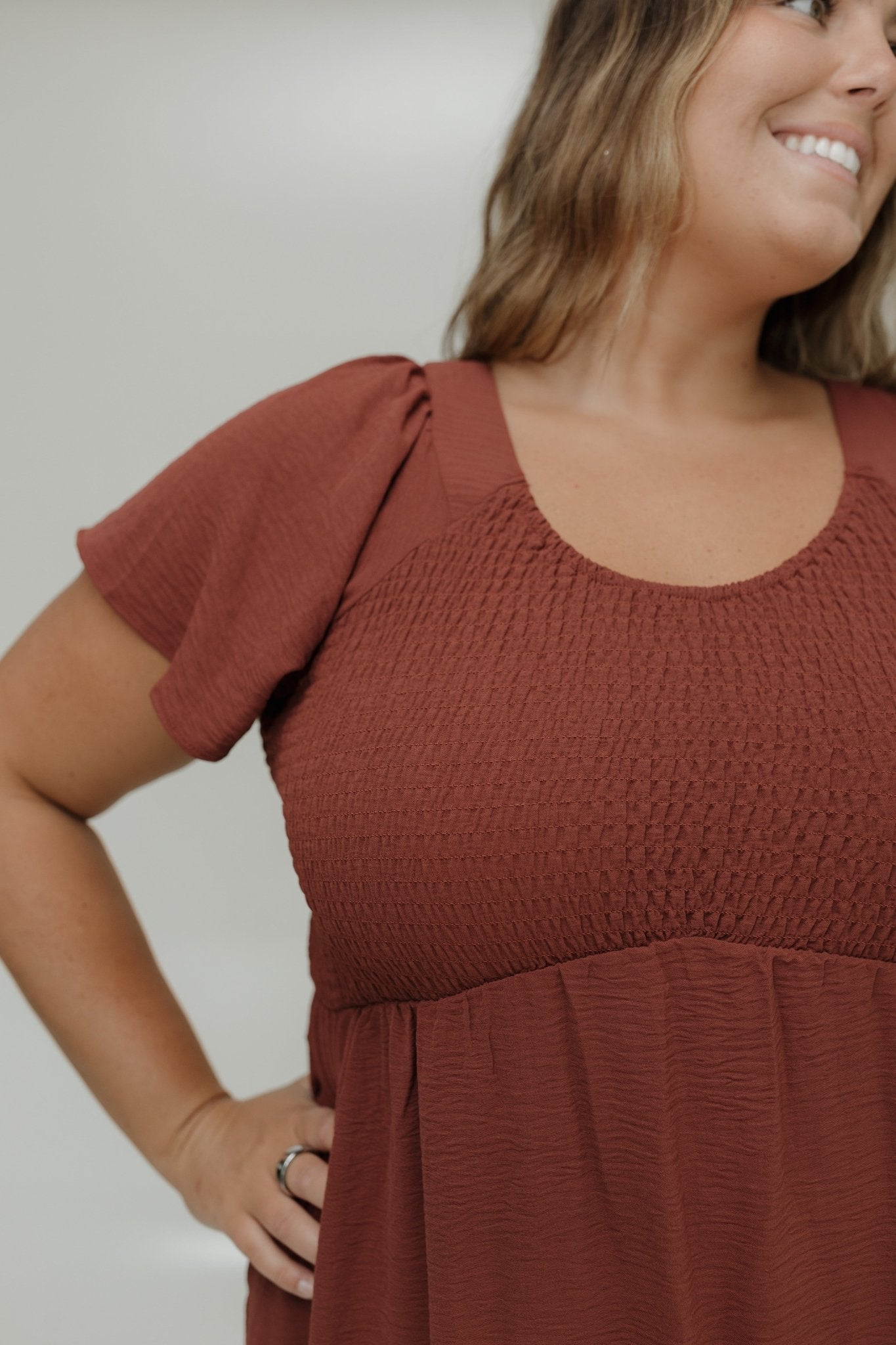 SOLID SMOCKED BODICE MIDI LENGTH DRESS IN RED CLAY