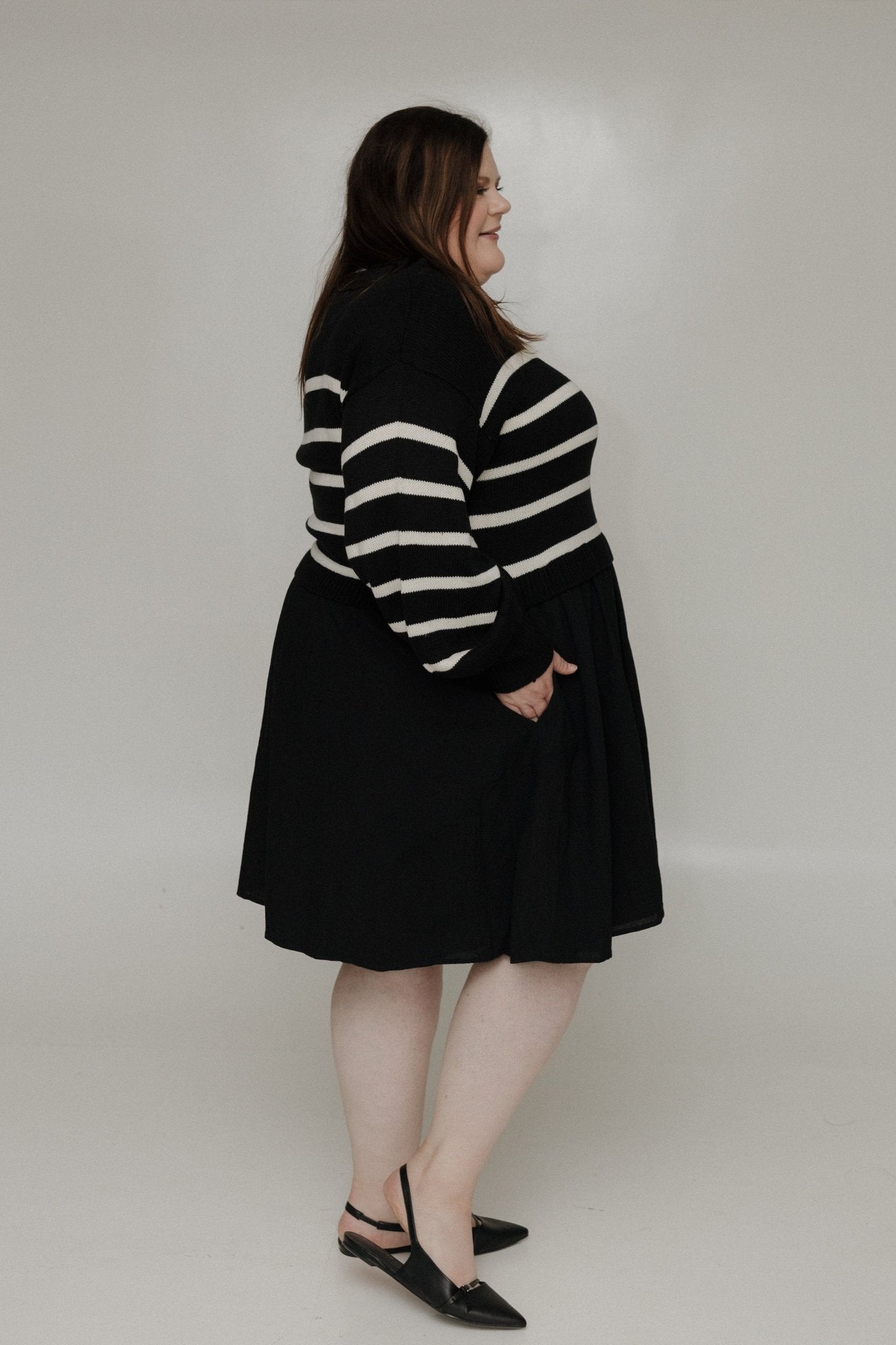 Meet your new cozy-chic dress. The Striped Sweater Bodice Dress in Black & Cream is designed for mid-size and plus-size women who want effortless style without sacrificing comfort. Featuring a soft sweater knit bodice with large, varied stripes, this dress creates a flattering silhouette for every body.