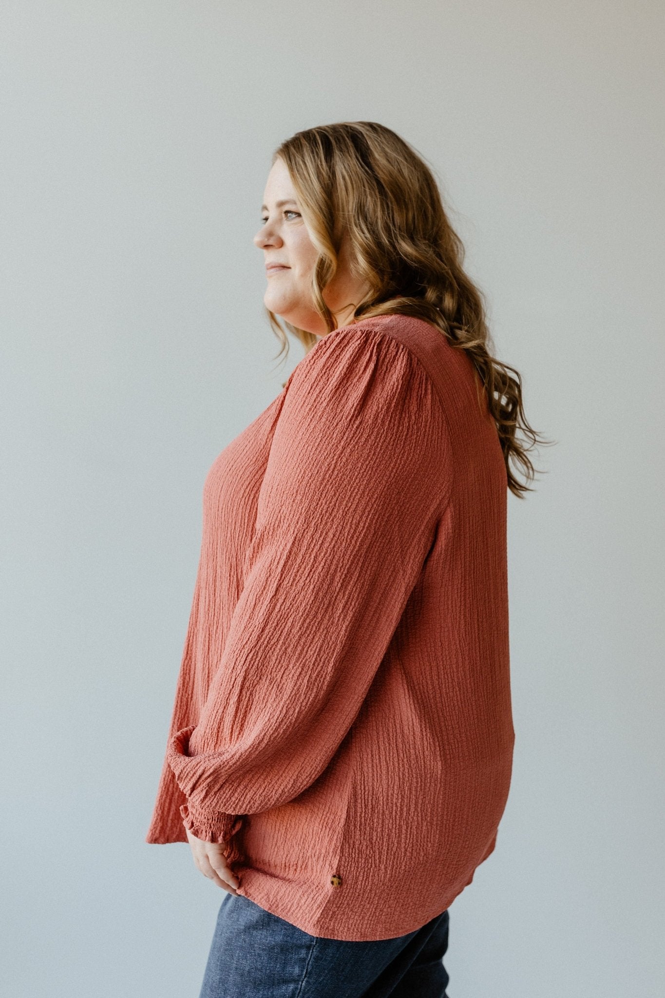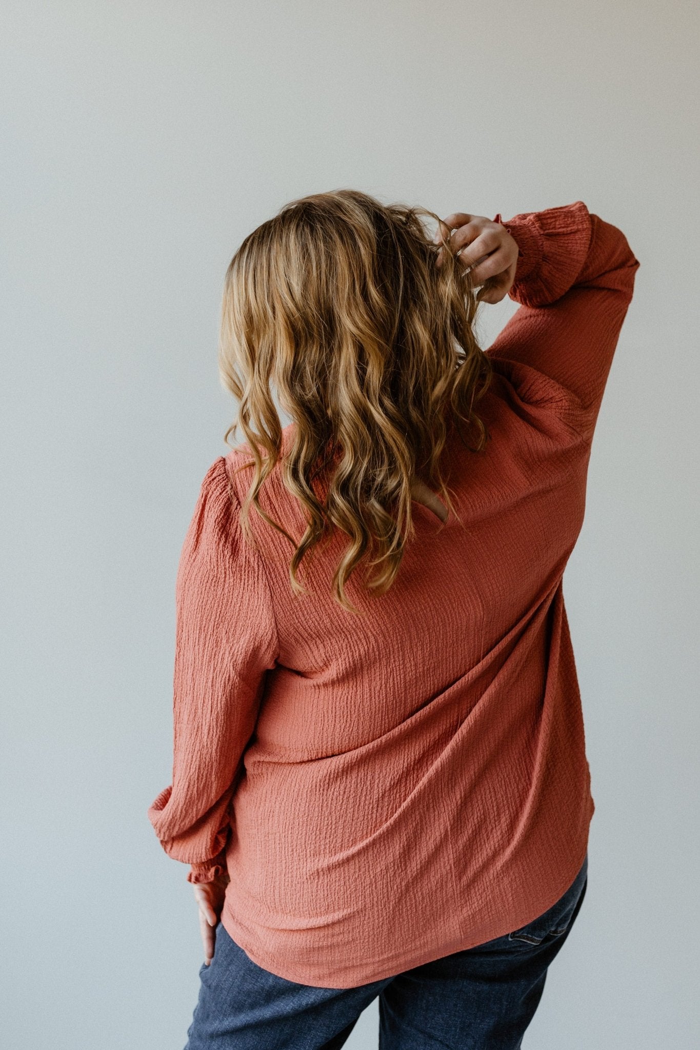 Elevate your wardrobe with our spiced rose Ruffle Textured Blouse. Featuring long puff sleeves with elastic cuffs, a ruffle neckline, and shoulder puffs, this versatile blouse adds texture and elegance to any ensemble. Perfect for both work and play, it's the perfect addition to your closet. Fits true to size. We suggest going with your typical size. Stacey is wearing a size 18. Want more information about the model? Visit our Lovely Models page.