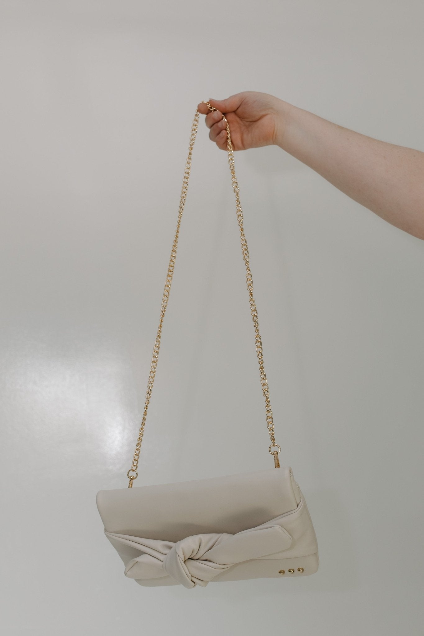 Turn every outing into a style moment with the Bow Convertible Clutch in soft, sophisticated Cream. This chic and versatile handbag is your new go-to accessory—perfect for brunches, weddings, date nights, and everything in between. Designed with a bold front bow, luxe gold corner studs, and crafted in this elegant neutral shade, this mid-size clutch transforms into a crossbody or shoulder bag with the hidden 45” chain strap.