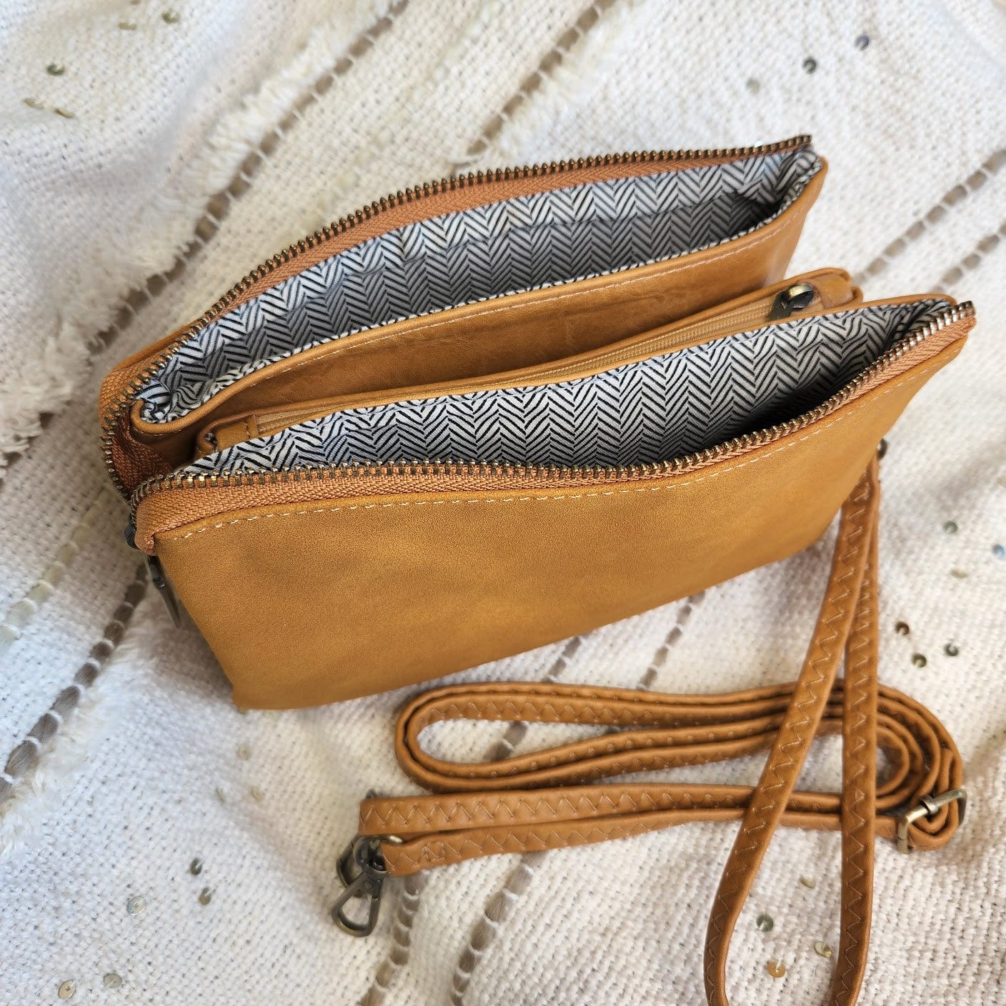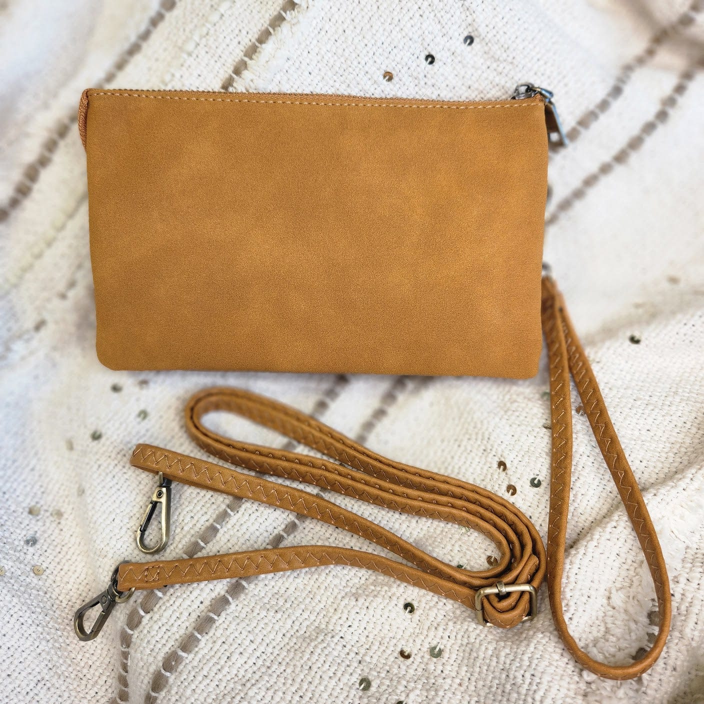 Simply understated, but so many pockets and room to hold all of your essentials! The fun mustard color adds a fun pop to this classic style. It has a zip closure, a detachable wrist or shoulder strap that can be worn on the shoulder or crossbody, and supple faux suede.