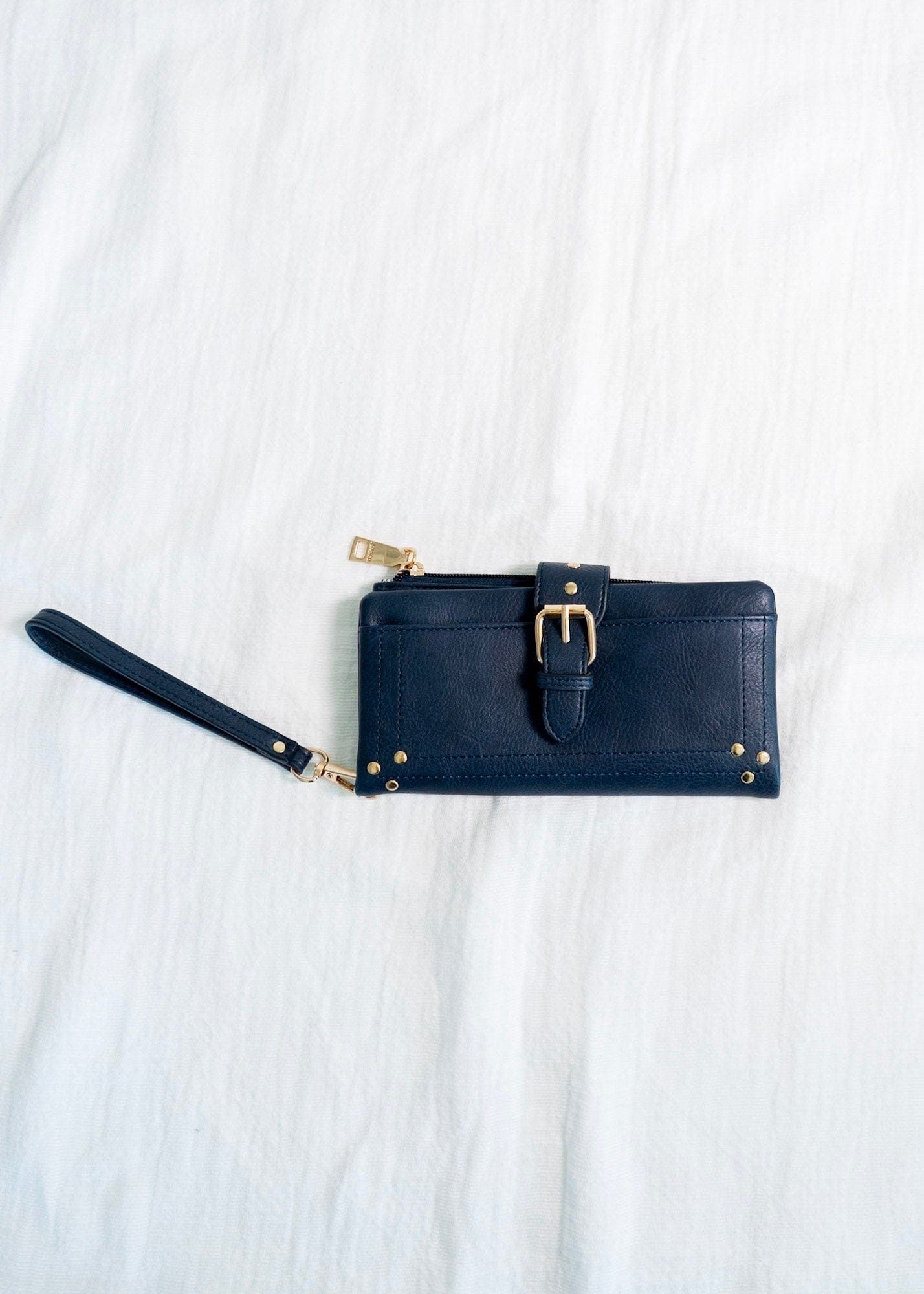 Stay organized while staying fashionable with this fabulous wristlet wallet! Boasting a removable wristlet strap and a zip top closure with a buckle front snap, this gorgeous navy wallet is perfect for any occasion. Keep your cards, cash, and other valuables close with this stylish and secure solution.