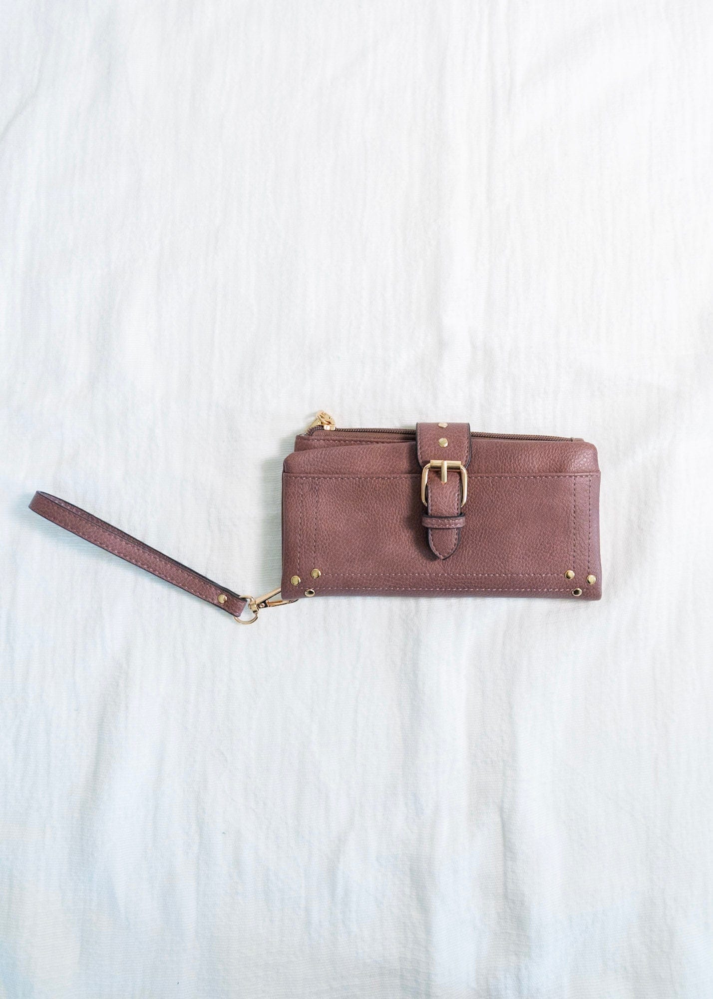 The WRISTLET WALLET WITH BUCKLE DETAIL IN WINE is the perfect choice for the on-the-go person. This wallet/clutch combo gives you both convenience and style. Zip up your important items and buckle down for protection. Plus the removeable wristlet strap is hassle free for grab 'n' go moments. Show off your style, secure your belongings, and keep life moving!