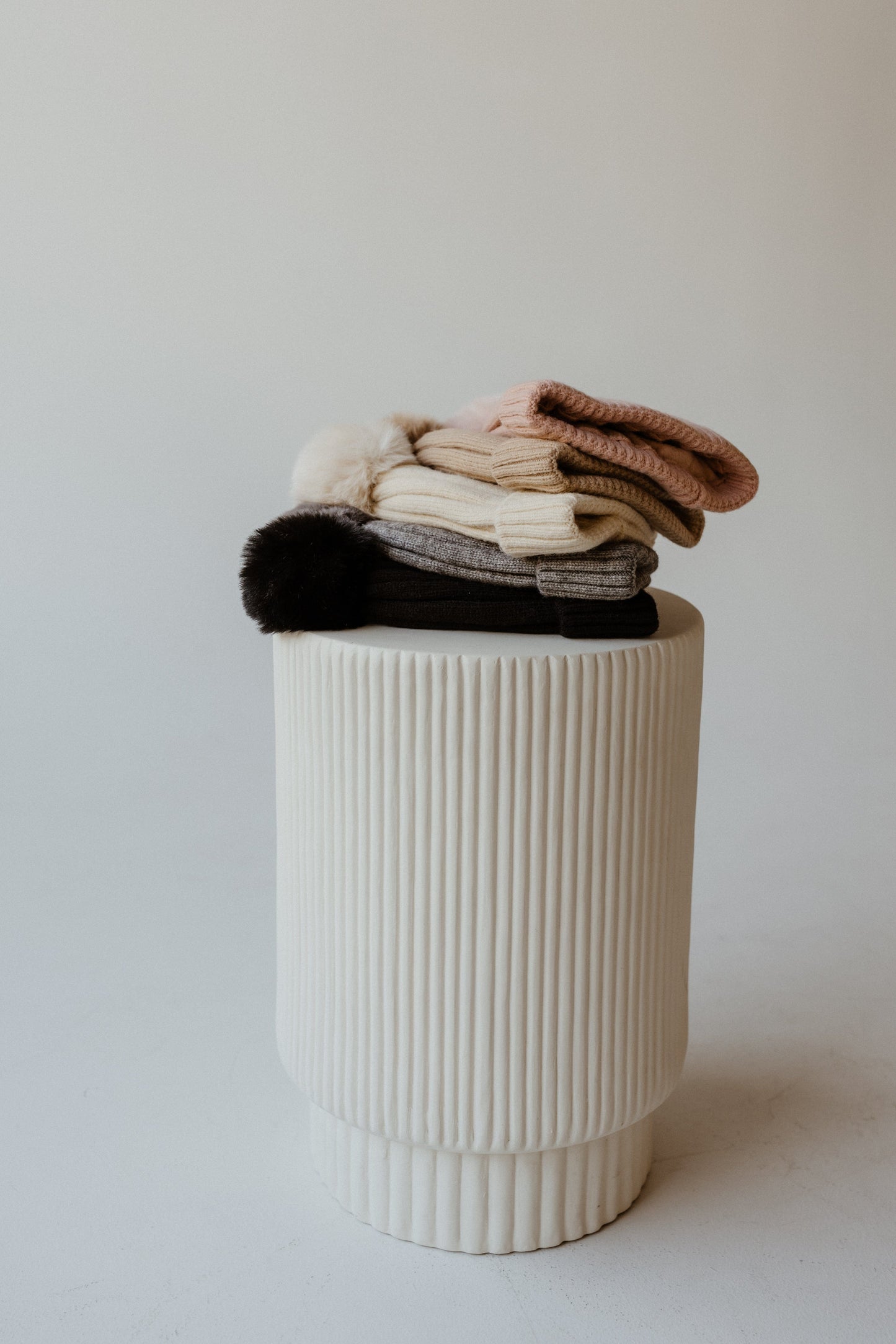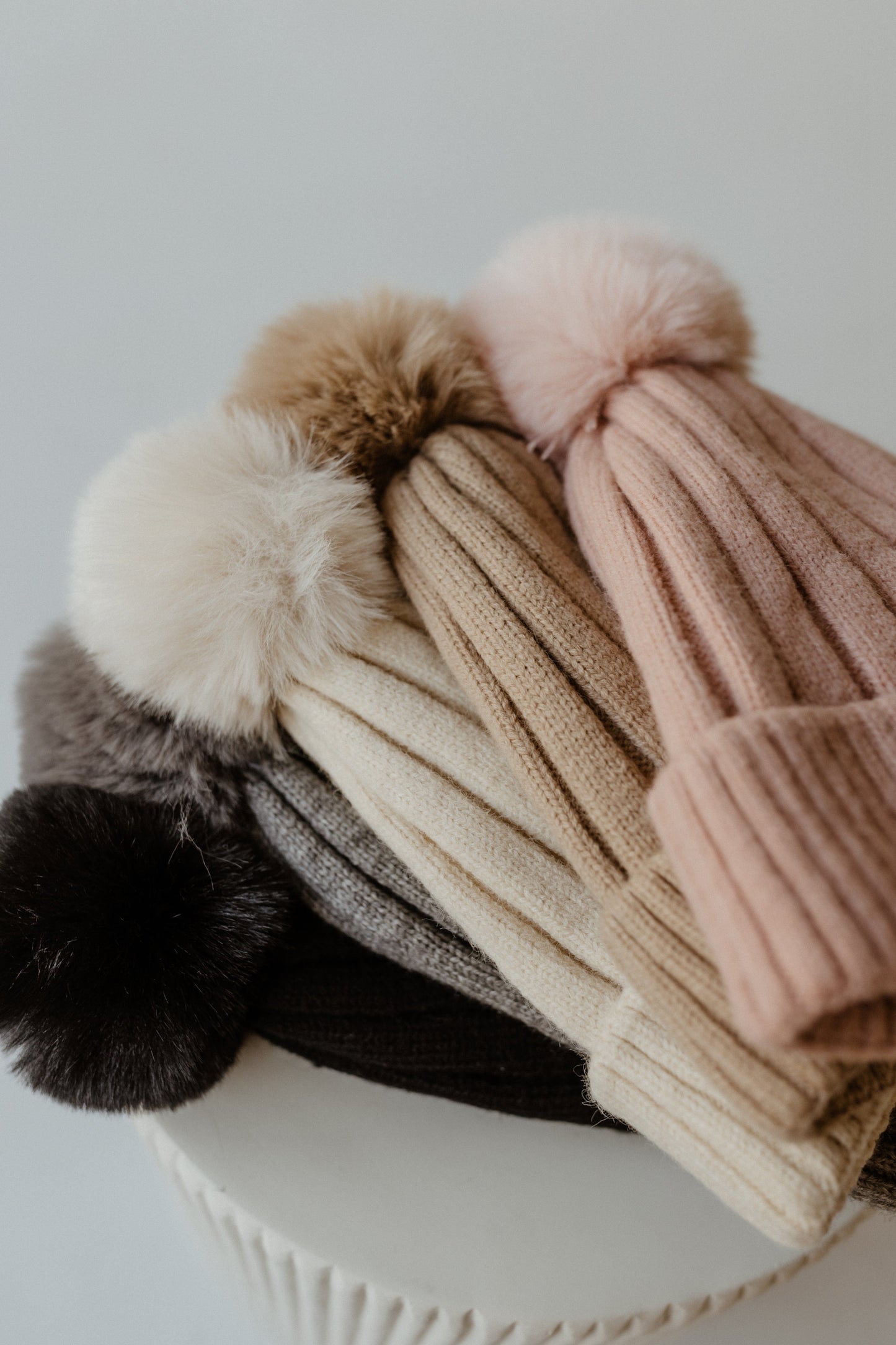 Keep your head cozy and stylish with this ribbed taupe beanie with a luxuriously fluffy faux fur pom! Perfect for chillier days, it'll keep your head toasty while also elevating your look with its fashionable puff detail. Winter's never looked so good!