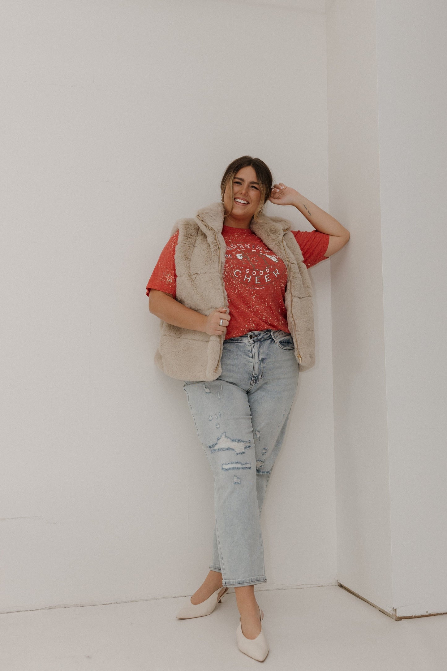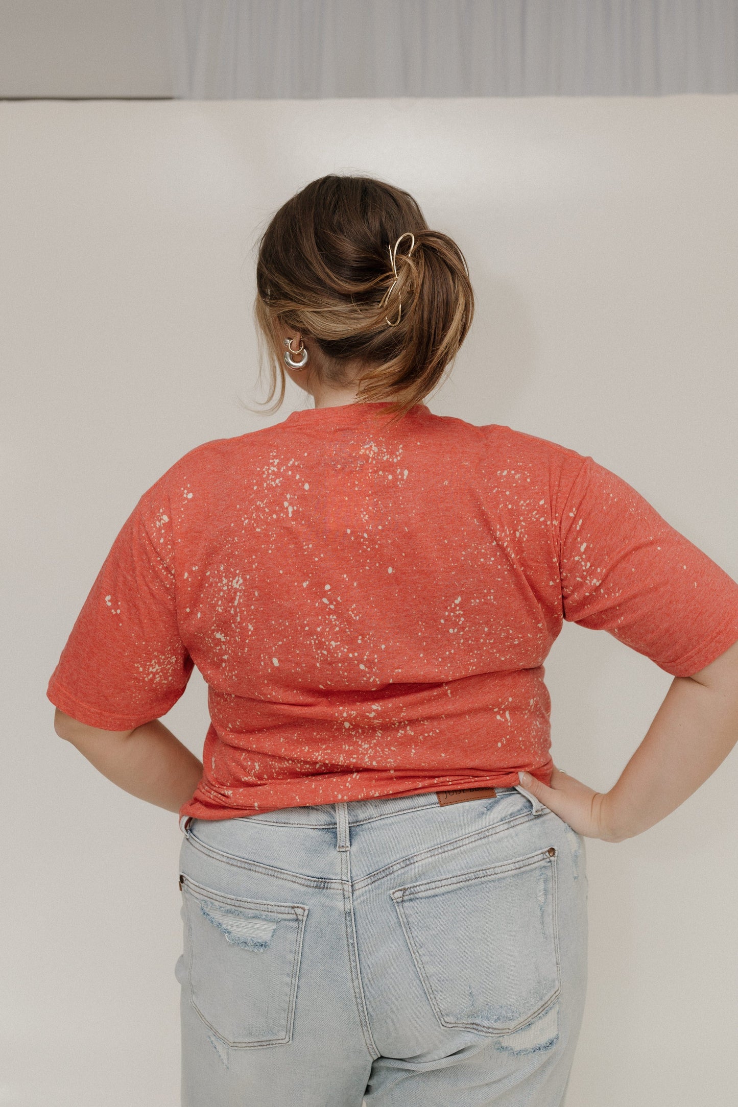 Spread joy in the “Working On My Good Cheer” Graphic Tee — the perfect mix of cozy comfort and holiday sass. Designed for mid and plus-size women, this festive red tee adds instant cheer with its playful bleach-splatter design and witty quote. Crafted from a soft tri-blend fabric with short sleeves and a classic crew neckline, it’s perfect for layering under shackets, cardigans, or jackets. Each piece is hand-bleached for a one-of-a-kind look that celebrates individuality and confidence.