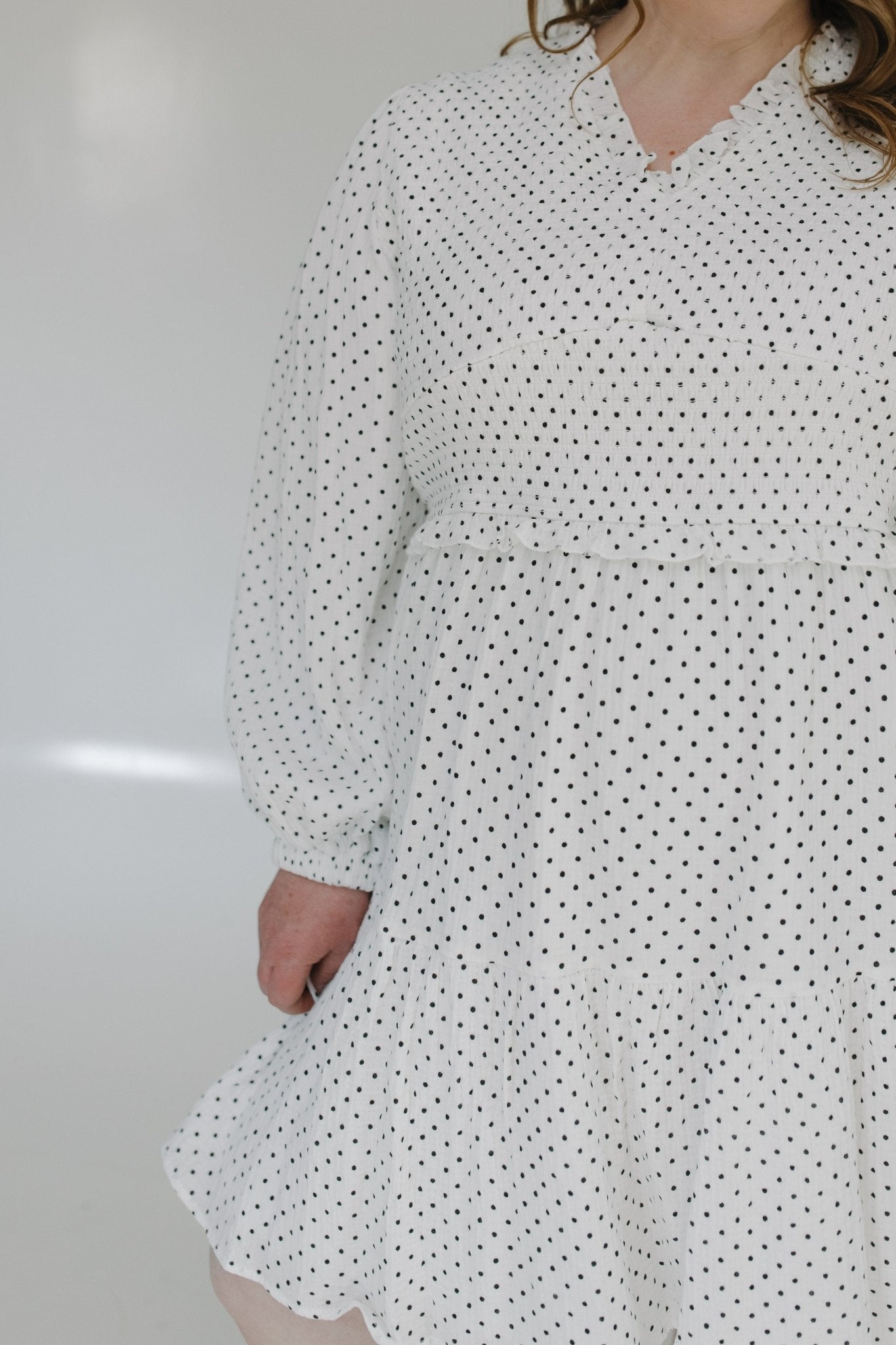 Classic yet effortlessly on-trend, this stunning dress blends sophistication with a touch of adorable charm! Featuring long blouson sleeves, delicate ruffle details at the waist and neckline, and a flattering smocked bodice, this piece is designed to highlight your shape while keeping you comfortable. The knee-length hem and v-neckline show just the right amount of skin, striking the perfect balance between flirty and refined.
