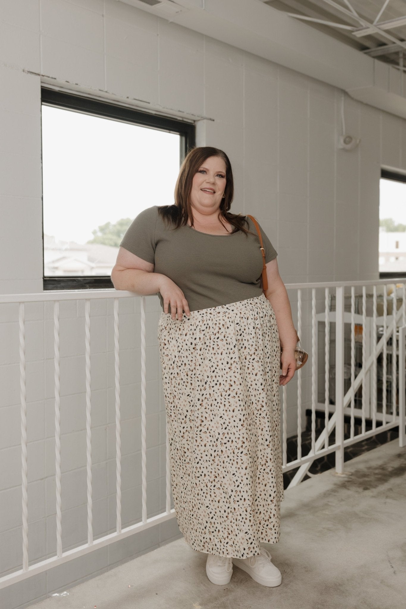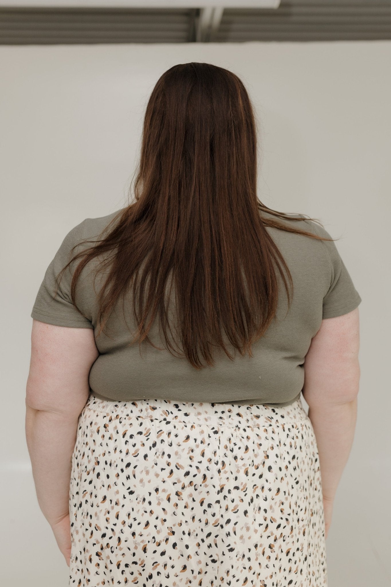 Meet your new go-to: the Ribbed Essential Scooped Neck Sweater Tee in Forest Haze—an elevated basic designed for mid and plus-size women who want effortless style without sacrificing comfort. This flattering short-sleeve tee features a scoop neckline that frames your face beautifully, while the soft, 100% cotton ribbed knit hugs your curves in all the right places without clinging.