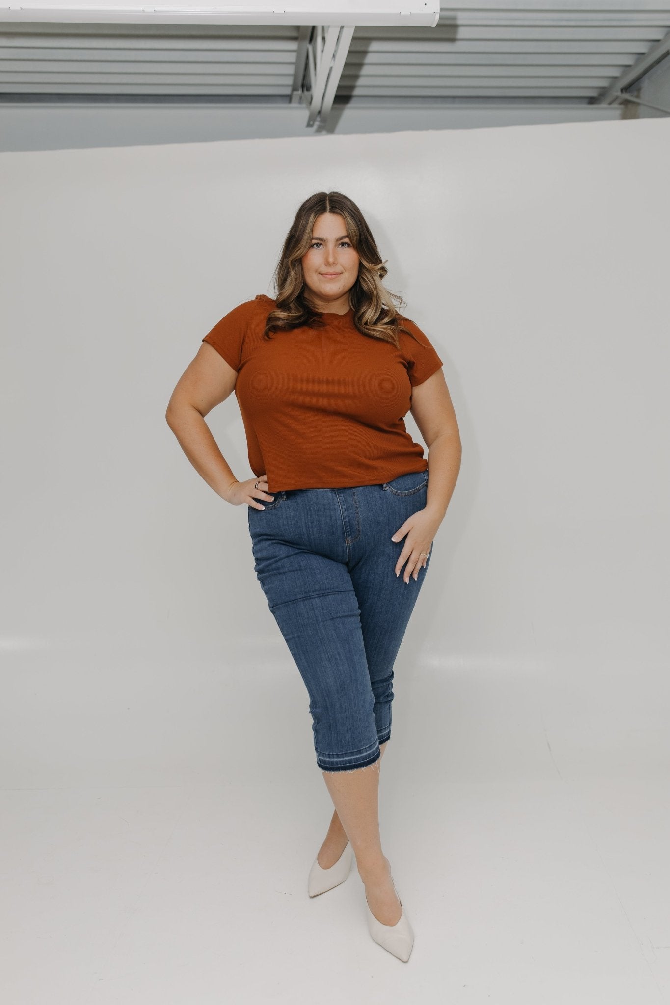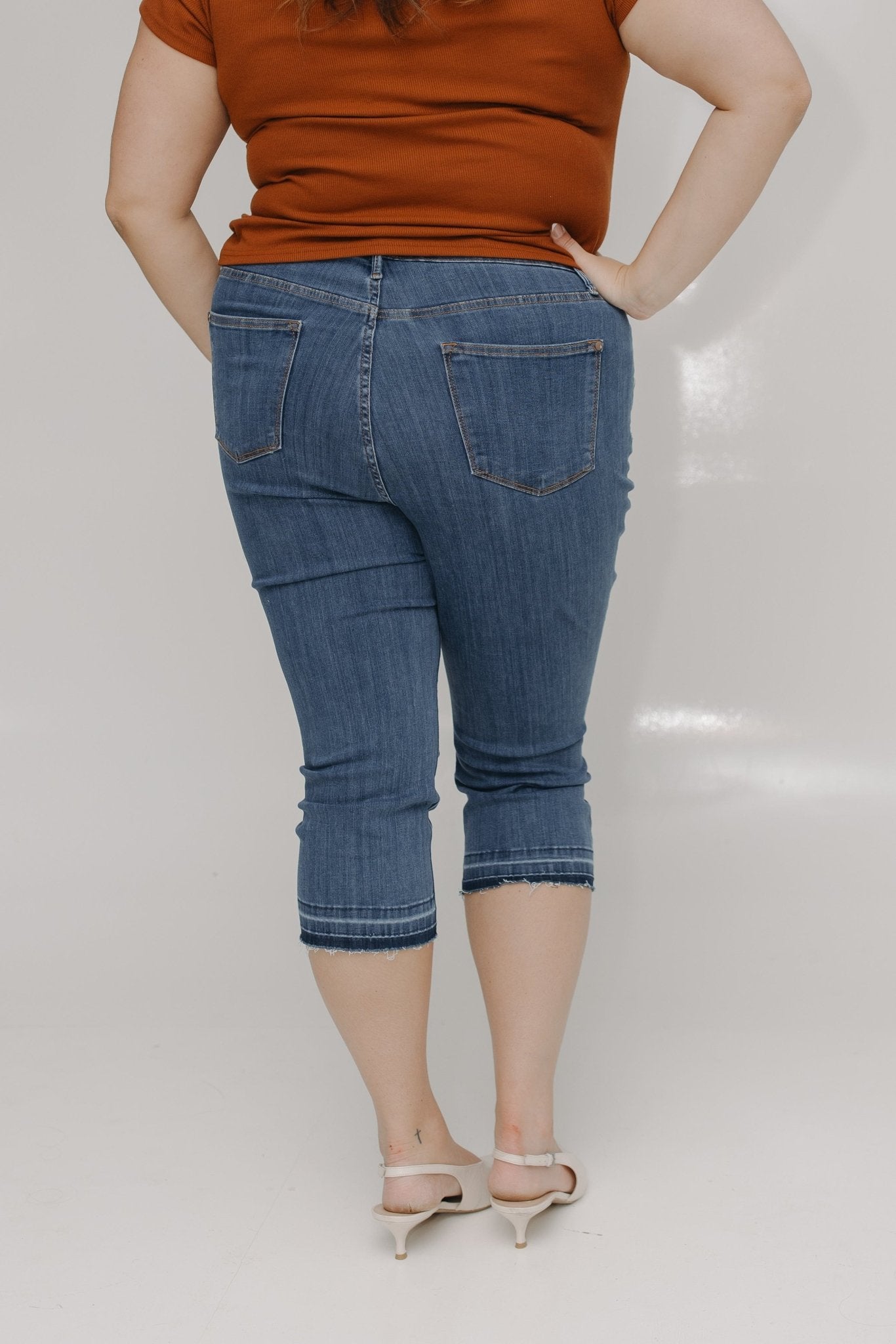 Experience comfort and style in our High Waist Pull On Capri with Pockets. Made with Judy Blue stretch, this 22" inseam capri features a raw hem detail for a cute and unique touch. The high-waisted 11" rise offers a comfortable fit without digging into your tummy. Perfect for any occasion. If you have not worn Judy Blue jeans before, go one size down from your typical size. Kaylee is wearing a size 16. Want more information about the model? Visit our Lovely Models page.