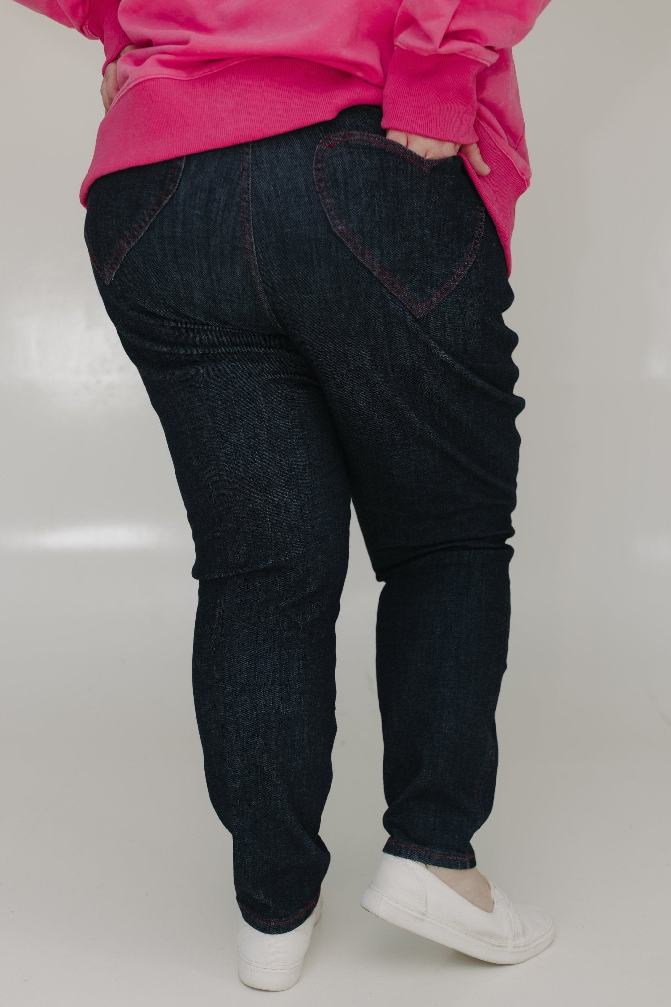 Fall in love with denim that loves you back! The Judy Blue High Waist Skinny Jeans with Heart Shaped Back Pockets bring the perfect mix of curve-flattering structure and playful detail. Made in a super dark wash with a high 11" rise, these skinnies cinch your waist while keeping you comfortable with a touch of stretch. The heart-shaped back pockets and red stitching add a fun pop of personality, while the darting detail enhances your natural shape. With a 29" inseam, these jeans are ideal for dressing up with heels or keeping it casual with sneakers.