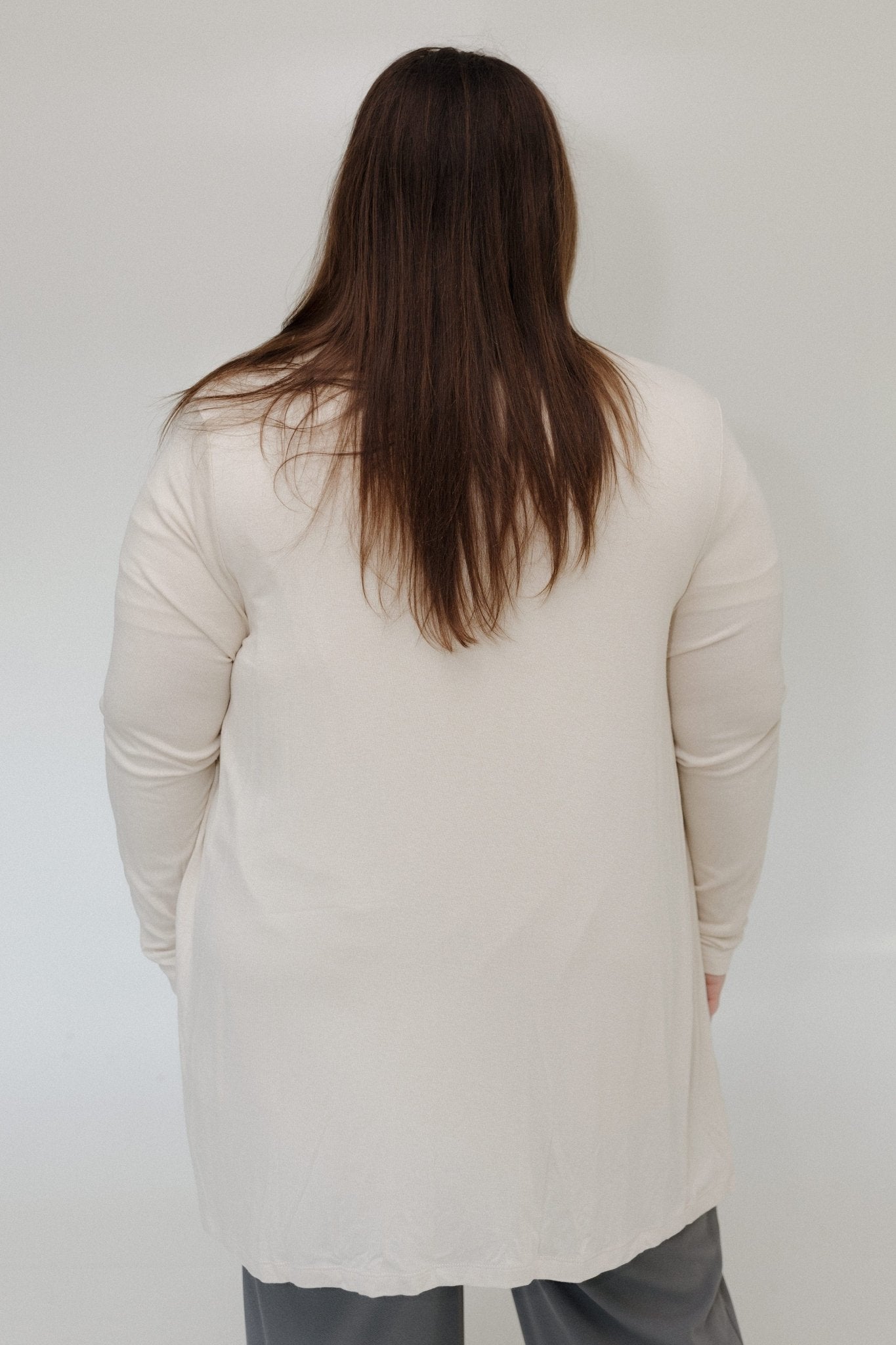 Meet the layering piece your wardrobe has been waiting for—our Essential Lightweight Long-Sleeved Cardigan in Bleached Sands. Designed with the perfect balance of flow and structure, this cardigan drapes beautifully without clinging and adds polish to any outfit without the bulk or heat. The open-front design, slight duster length, and luxe viscose-blend fabric make it a versatile staple you’ll reach for season after season.