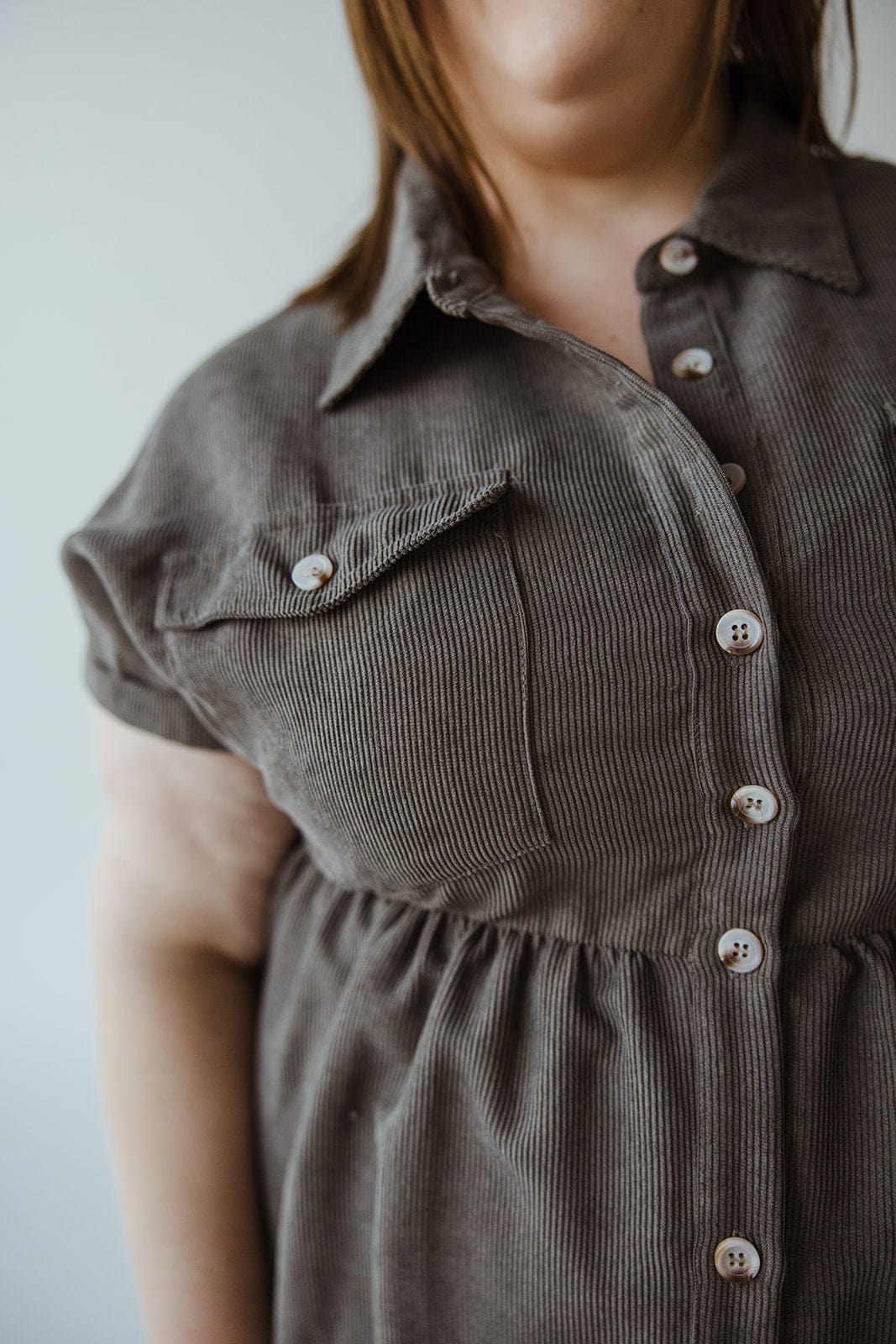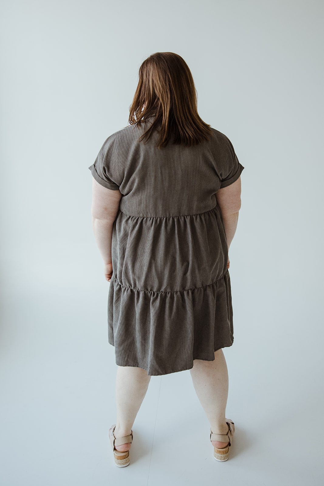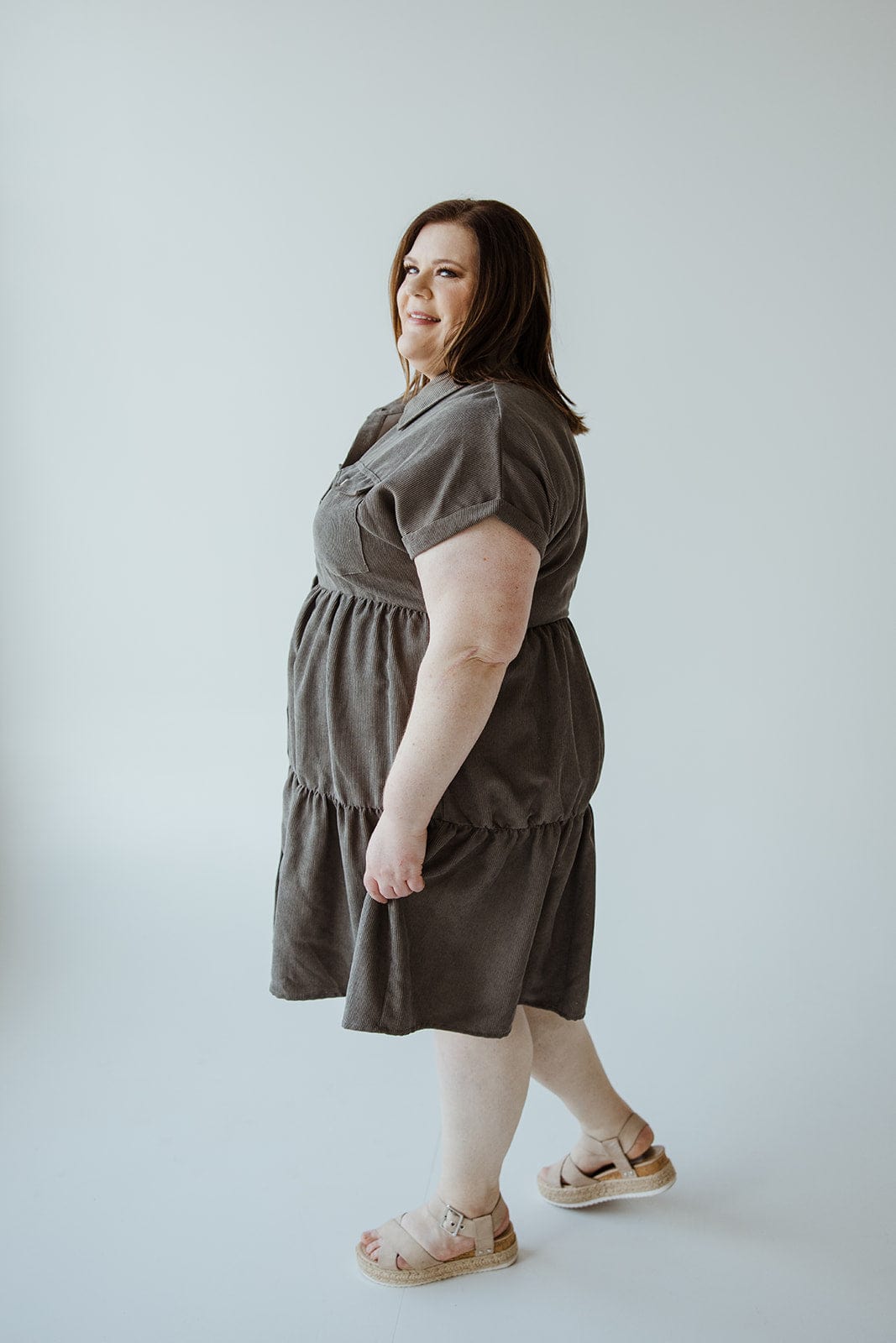 This CORDUROY BUTTON FRONT KNEE LENGTH DRESS is the perfect blend of cozy-cute style! The soft, lightweight corduroy fabric gives serious snuggle vibes, while the double breast pockets and tiered skirt keep it fashionable. Step into smoky olive style with this irresistibly comfy dress – button it up, and you're good to go! We suggest going up a size from your typical. Leah is wearing a size 2x. Want more information about the model? Visit our Lovely Models page.