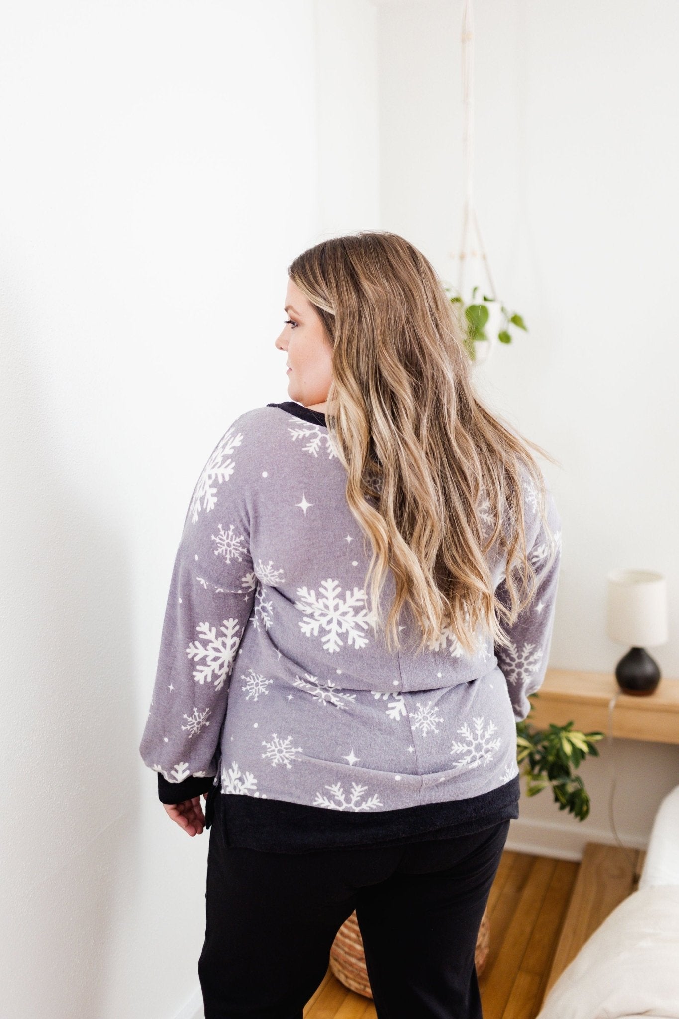 You'll be festive and cozy whether you're lounging or running errands in this fun snowflake tee! It is perfectly paired with leggings or jeans! It has a wide v-neckline that is accented in black, long-dolman style sleeves that are cuffed in black, tunic length that is accented in black with a split hemline for easy movability and is in a lightweight fleece-like fabric. Fits true to size.